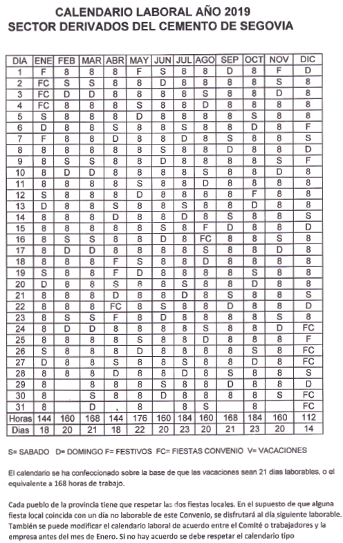 RESOLUCIÓN DE LA OFICINA TERRITORIAL DE TRABAJO DE SEGOVIA POR LA QUE SE ACUERDA LA INSCRIPCIÓN Y PUBLICACIÓN DEL CALENDARIO LABORAL DE 2019 DEL SECTOR DE DERIVADOS DEL CEMENTO EN LA PROVINCIA DE SEGOVIA.