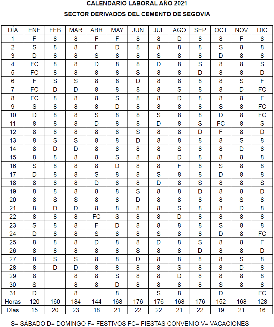 El calendario se ha confeccionado sobre la base de que las vacaciones sean 21 dias laborables, o el equivalente a 168 horas de trabajo.