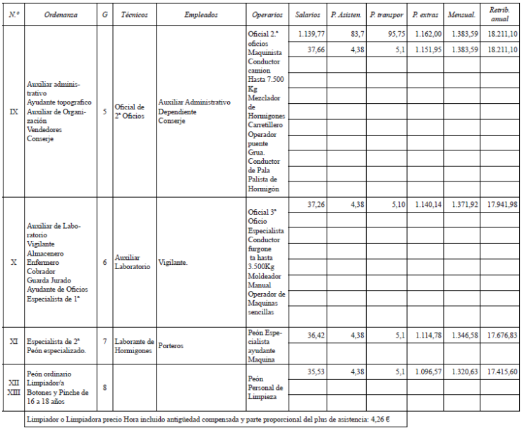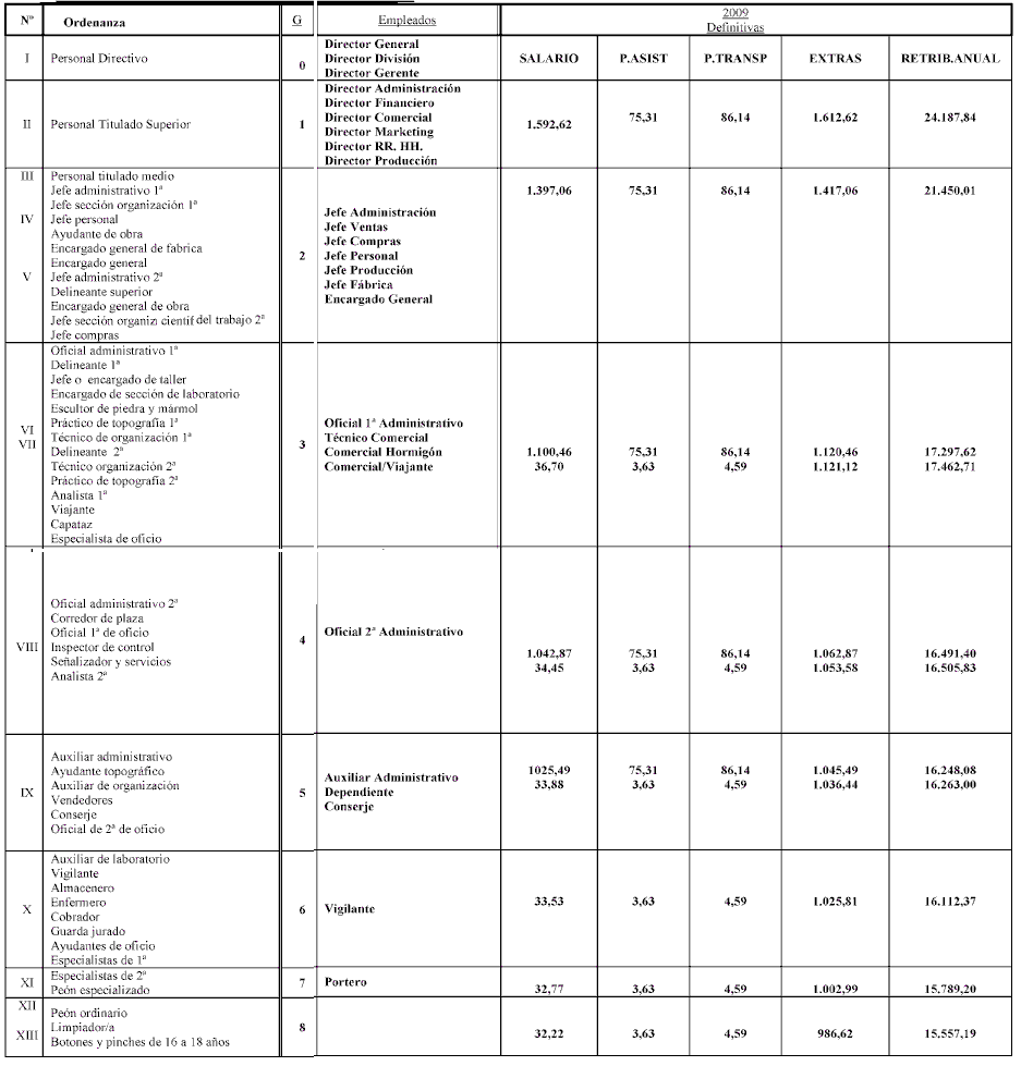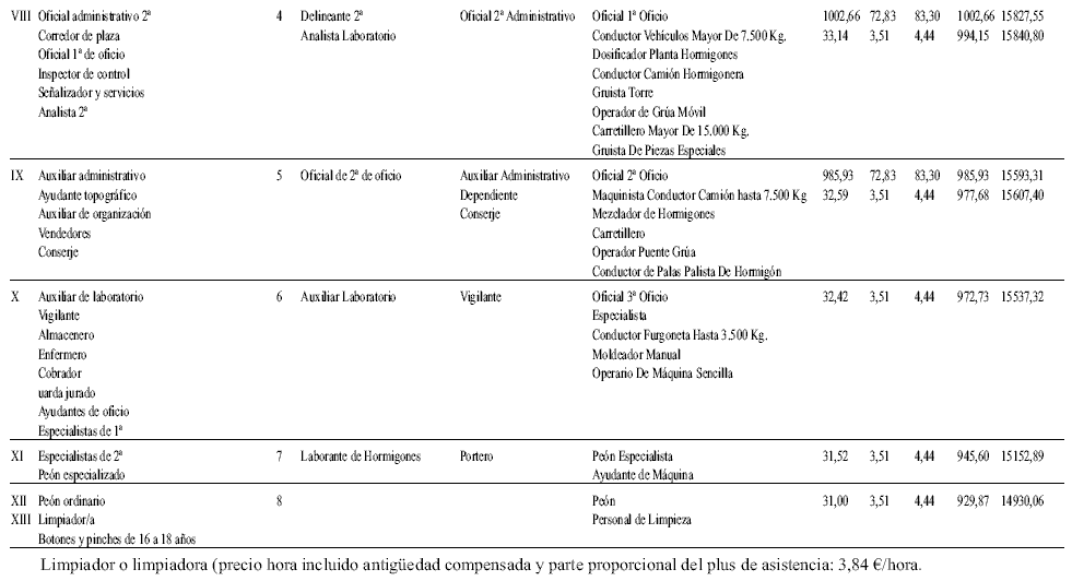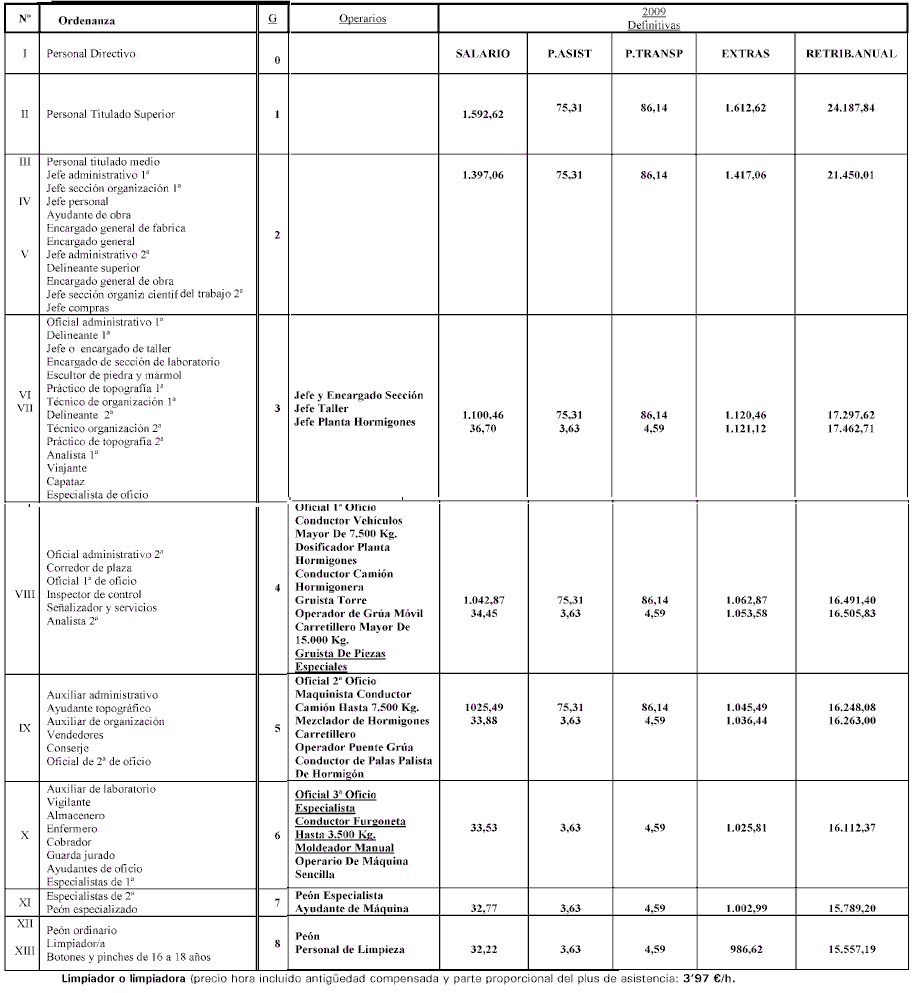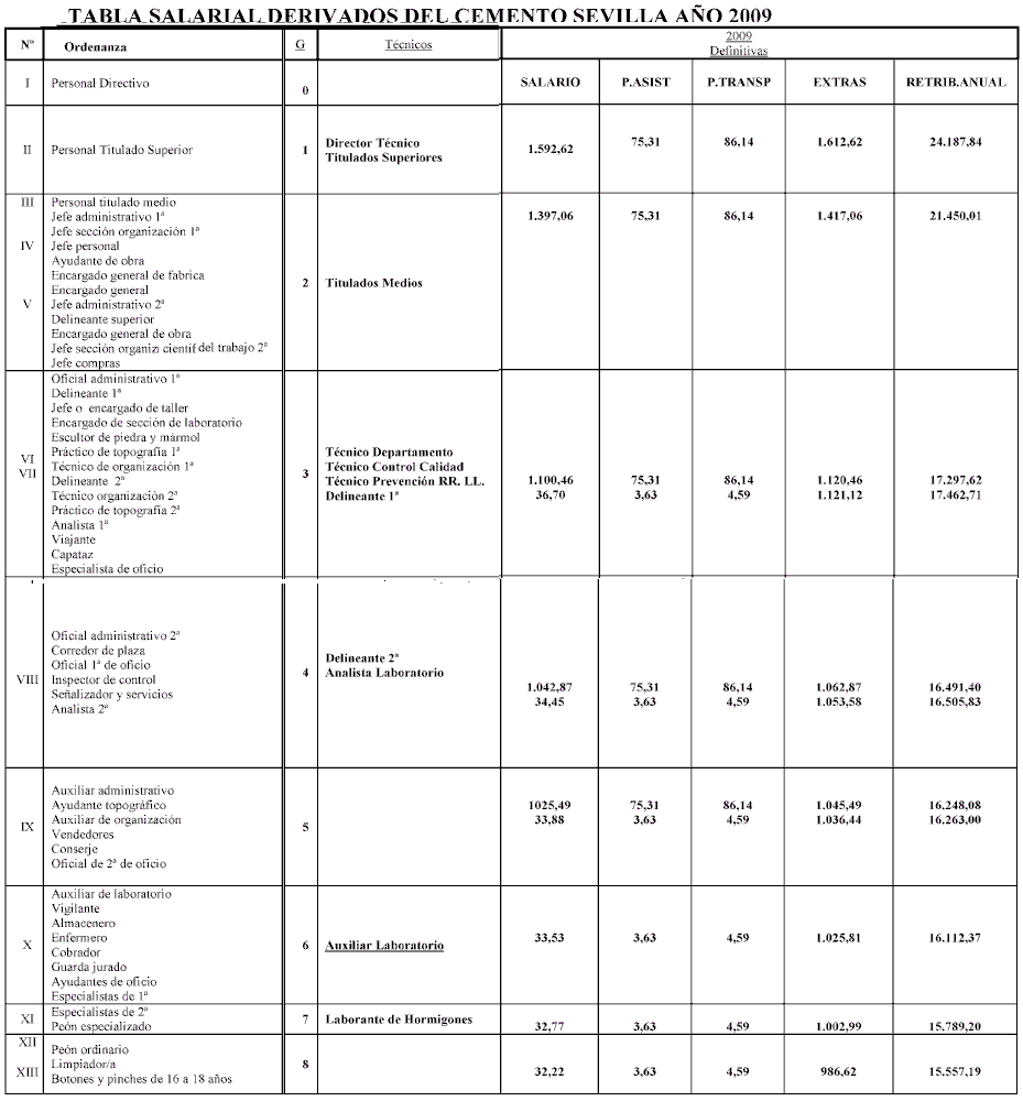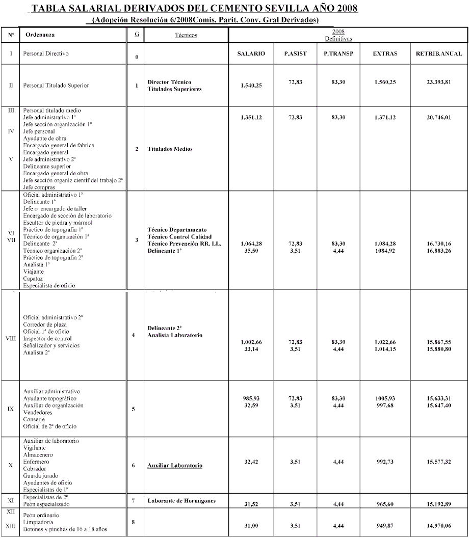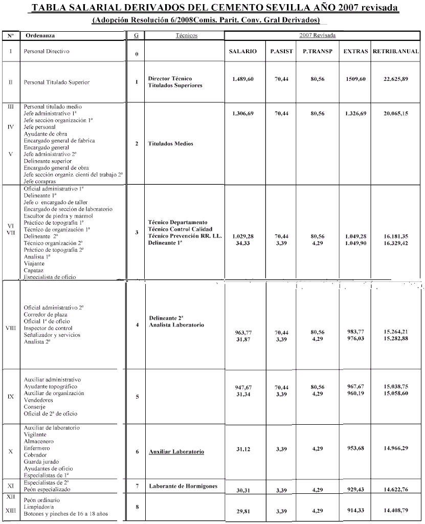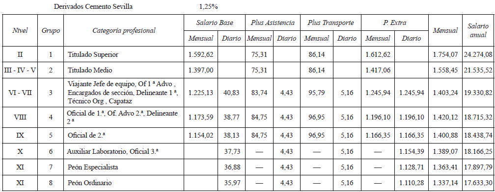 Primero: Con efectos de 1 de enero de 2019, elevar las tablas salariales vigentes del Convenio Colectivo Provincial del sector de derivados del cemento de la provincia Sevilla en un 1,25%, subida que afectará a todos los grupos profesionales cuyas retribuciones se encuentran por debajo de lo dispuesto en el Convenio sectorial Estatal, de ahí que queden al margen de dicha subida los grupos profesionales I y II.