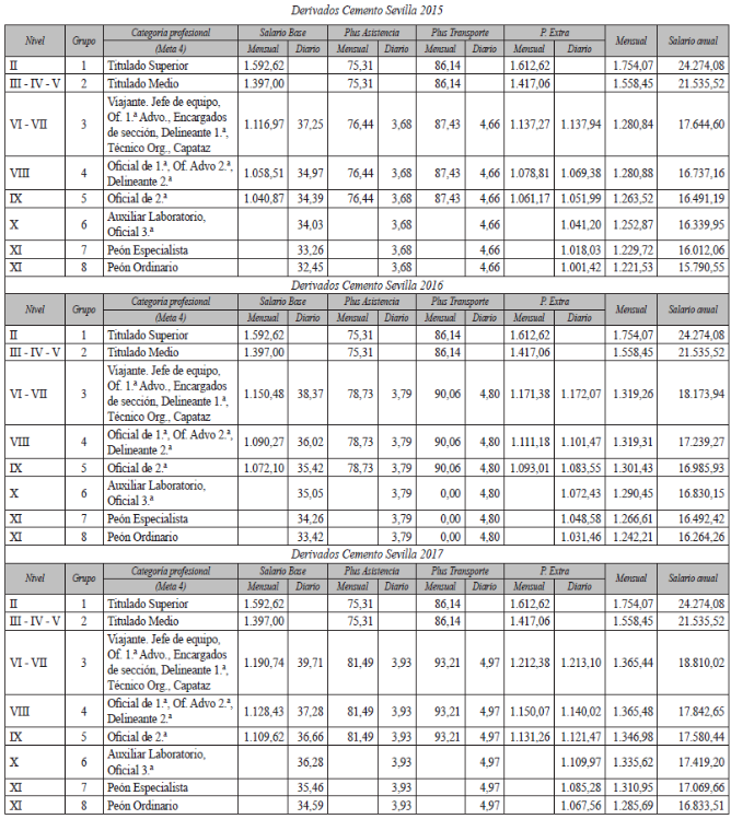 Segundo.- De conformidad con lo anterior, las tablas salariales vigentes a la fecha de suscripción de la presente acta del Convenio Colectivo Provincial del Sector de Derivados del Cemento de la Provincia Sevillase elevarán con efectos de 1 de enero de 2018, en un 2,7% sobre las tablas vigentes.Se adjunta como Anexo Iformando parte integrante de la misma, tablas salariales revisadas.
