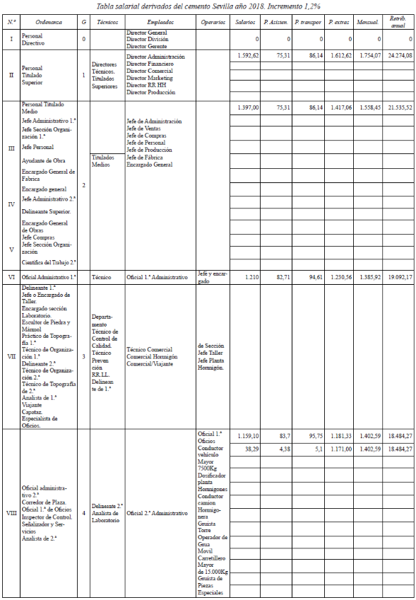 Segundo: De conformidad con lo anterior, las tablas salariales vigentes a la fecha de suscripción de la presente acta del Convenio Colectivo Provincial del sector de derivados del cemento de la provincia Sevilla se elevarán con efectos de 1 de enero de 2019, en un 1,25% sobre las tablas vigentes, con la excepción expuesta de los grupos profesionales I y II. Se adjunta como Anexo I formando parte integrante de la misma, tablas salariales revisadas.