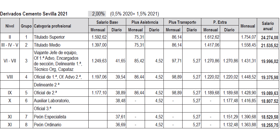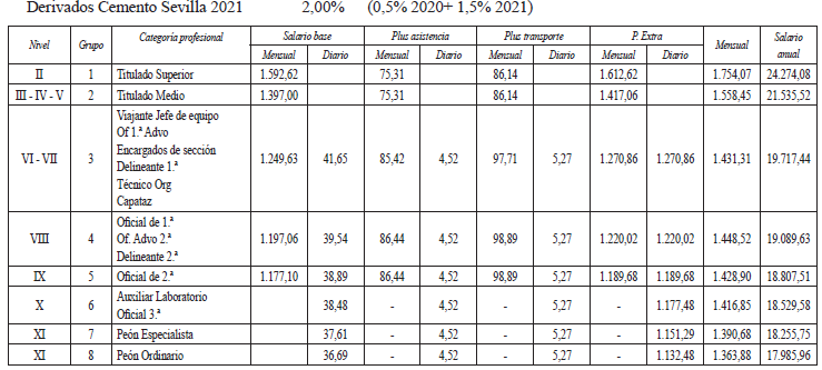 Segundo: De conformidad con lo anterior, las tablas salariales vigentes a la fecha de suscripción de la presente acta del Convenio Colectivo Provincial del Sector de Derivados del Cemento de la Provincia Sevilla se elevarán con efectos de 1 de enero de 2021, en un 1,5% sobre las tablas vigentes para 2020, con la excepción expuesta de los grupos profesionales I y II. Se adjunta como Anexo I formando parte integrante de la misma, tablas salariales revisadas.