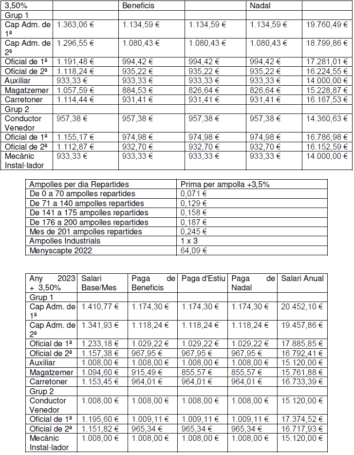 Tot el personal amb categoria de conductor/a venedor/a i mecànic/a instal·lador/a, han de percebre per aquest concepte i mensualment la quantitat contemplada a l’annex 1 de les taules salarials. Aquest concepte serà pel risc de portar diners a sobre. En cap cas es pot sancionar ni perjudicar econòmicament la realització d’aquesta tasca.