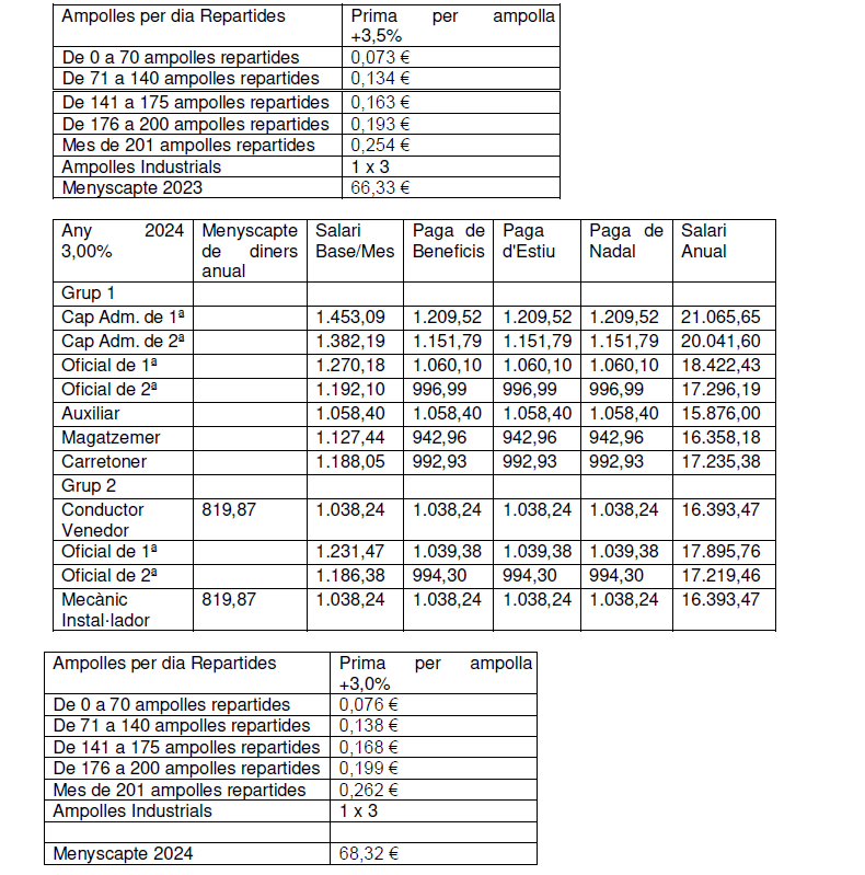 Es manté la prima de productivitat per ampolla repartida d’acord amb el tram contemplat a les taules salarials del annex 1.