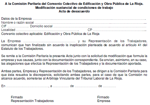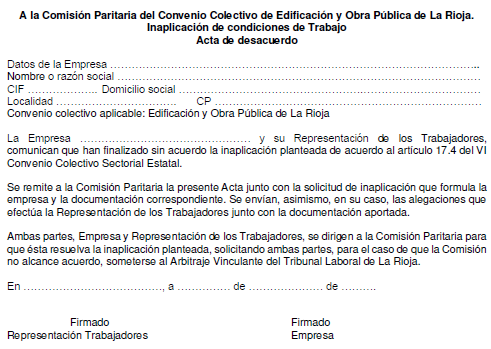 1. Cuando los convenios afectados correspondan a dos o más provincias o a una Comunidad Autónoma, el modelo de acta de desacuerdo sobre la inaplicación de condiciones de trabajo será el contenido en el Anexo IX del VI Convenio General del Sector de la Construcción.