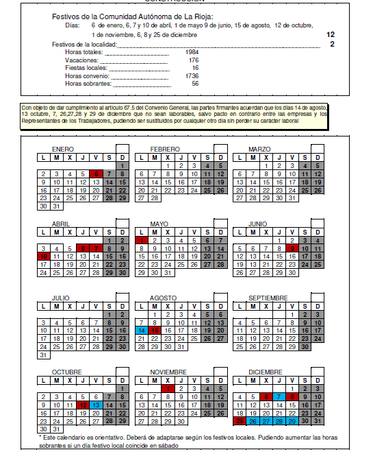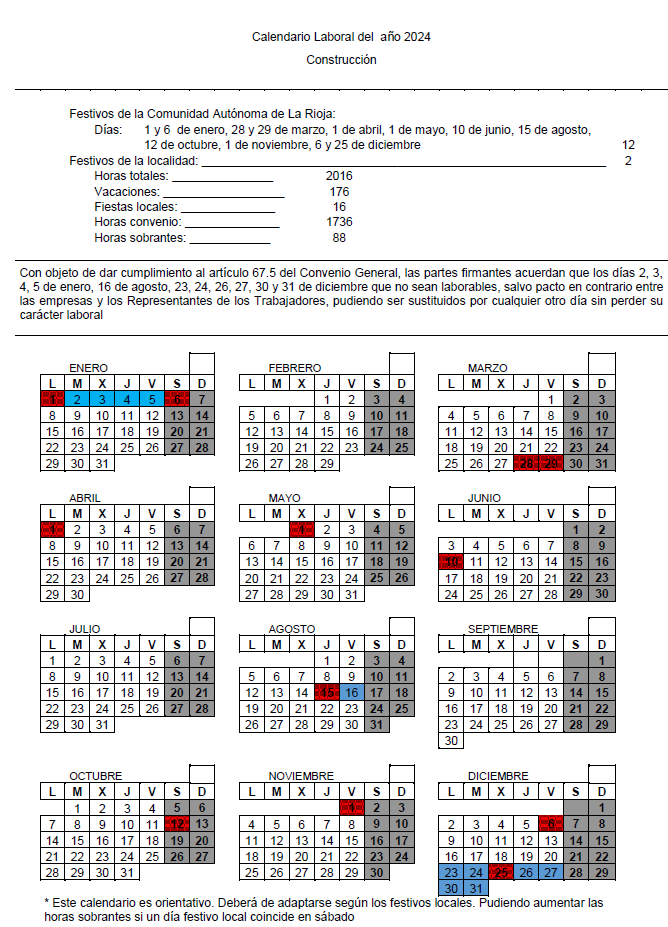 CONVENIO COLECTIVO DE EDIFICACIÓN Y OBRAS PÚBLICAS DE LA COMUNIDAD AUTÓNOMA DE LA RIOJA. CALENDARIO LABORAL AÑO 2024.