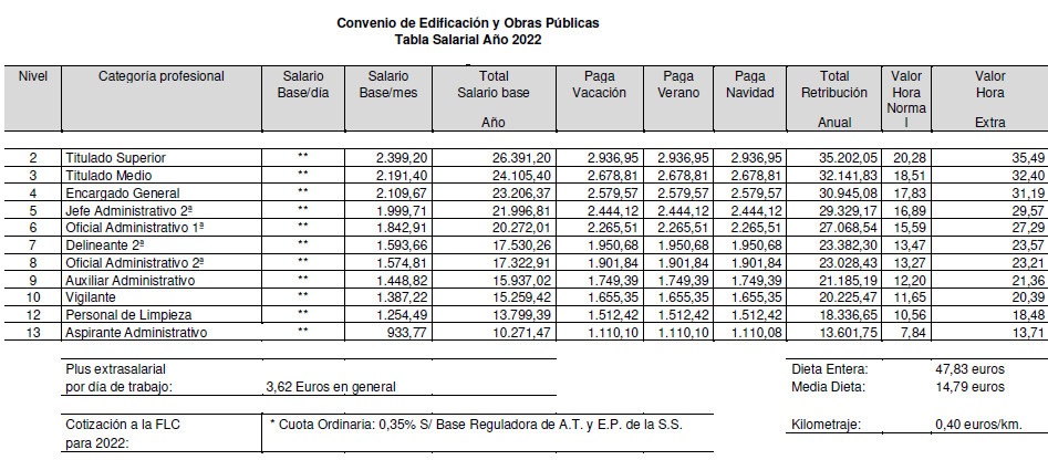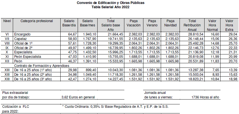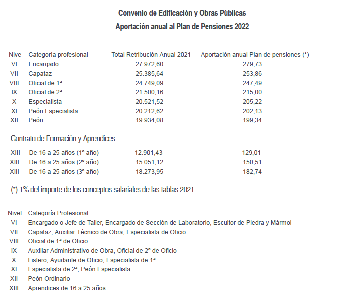 De acuerdo con lo estipulado al efecto en los artículos 20.2 y 25.5 del presente Convenio Colectivo, durante el año 2022 los trabajadores afectados por este Convenio percibirán por el concepto de salario y plus extrasalarial desde el 1 de enero al 31 de diciembre de 2022, el que para cada categoría profesional se detalla en las siguiente Tablas Salariales; todo ello sin perjuicio de lo previsto respecto del Plan de Pensiones en el artículo 21 del presente Convenio Colectivo y en el artículo 52.bis, apartado 4, del Acuerdo de modificación del VI Convenio General del Sector de la Construcción, publicado mediante Resolución de 23 de julio de 2022 de la Dirección General de Trabajo en el Boletín Oficial del Estado número 187 de 5 de agosto de 2022.