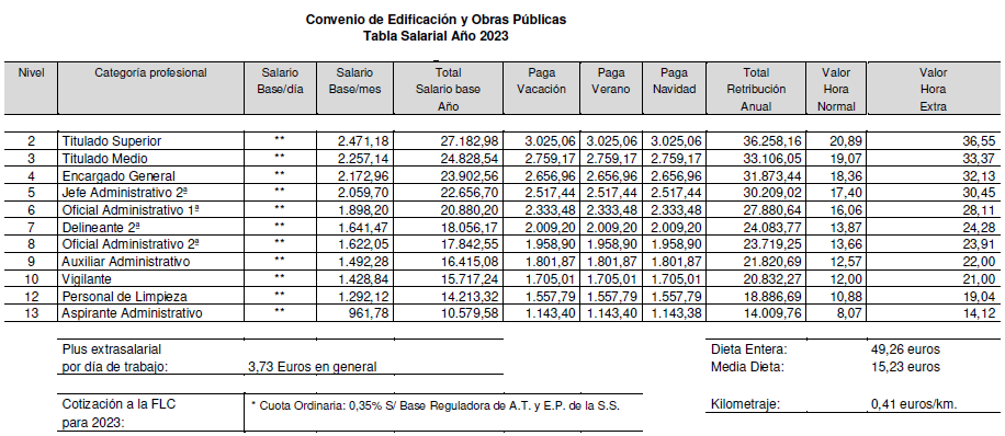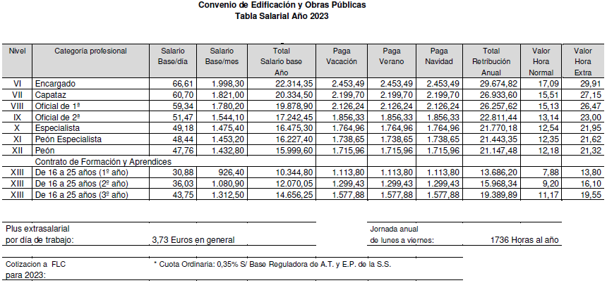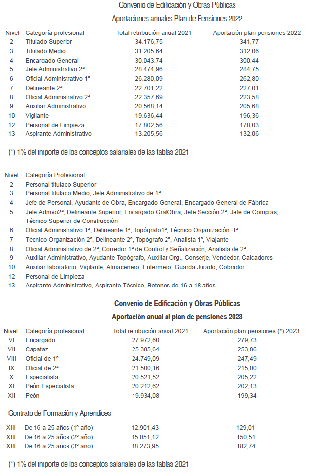 De acuerdo con lo estipulado al efecto en los artículos 20.2 y 25.5 del presente Convenio Colectivo, durante el año 2022 los trabajadores afectados por este Convenio percibirán por el concepto de salario y plus extrasalarial desde el 1 de enero al 31 de diciembre de 2023, el que para cada categoría profesional se detalla en las siguiente Tablas Salariales; todo ello sin perjuicio de lo previsto respecto del Plan de Pensiones en el artículo 21 del presente Convenio Colectivo y en el artículo 52.bis, apartado 4, del Acuerdo de modificación del VI Convenio General del Sector de la Construcción, publicado mediante Resolución de 23 de julio de 2022 de la Dirección General de Trabajo en el Boletín Oficial del Estado número 187 de 5 de agosto de 2022.