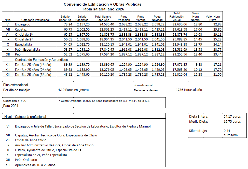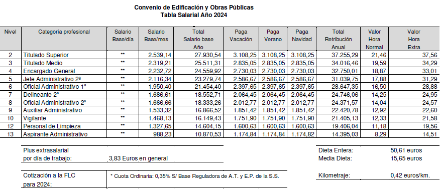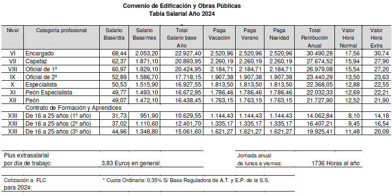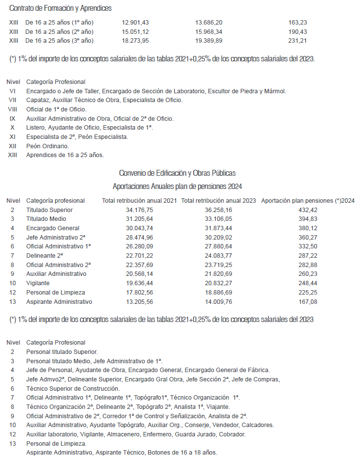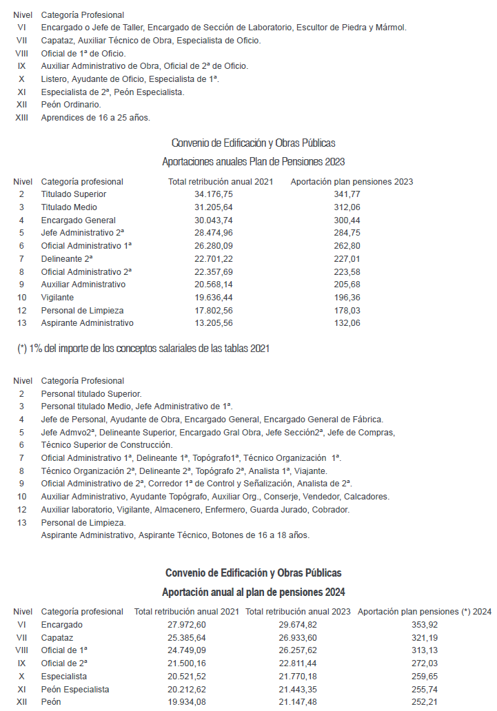 De acuerdo con lo estipulado al efecto en los artículos 20.2 y 25.5 del presente Convenio Colectivo, durante el año 2022 los trabajadores afectados por este Convenio percibirán por el concepto de salario y plus extrasalarial desde el 1 de enero al 31 de diciembre de 2024, el que para cada categoría profesional se detalla en las siguiente Tablas Salariales; todo ello sin perjuicio de lo previsto respecto del Plan de Pensiones en el artículo 21 del presente Convenio Colectivo y en el artículo 52.bis, apartado 4, del Acuerdo de modificación del VI Convenio General del Sector de la Construcción, publicado mediante Resolución de 23 de julio de 2022 de la Dirección General de Trabajo en el Boletín Oficial del Estado número 187 de 5 de agosto de 2022.