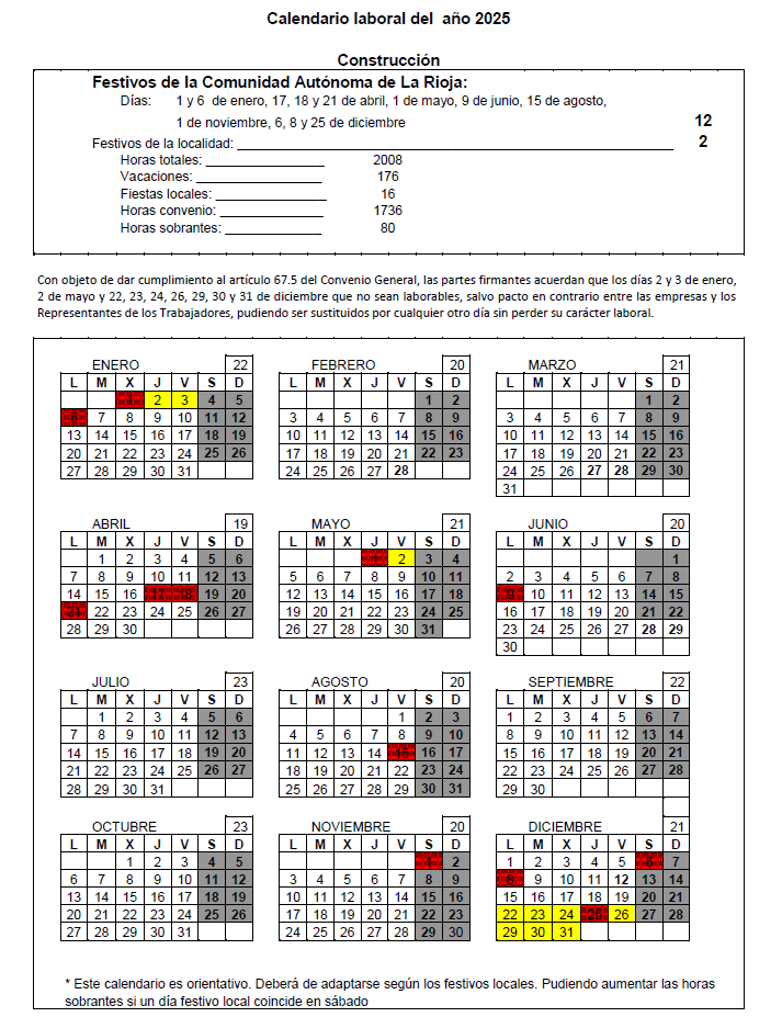 CONVENIO COLECTIVO DE EDIFICACIÓN Y OBRAS PÚBLICAS DE LA COMUNIDAD AUTÓNOMA DE LA RIOJA CALENDARIO LABORAL AÑO 2025.
