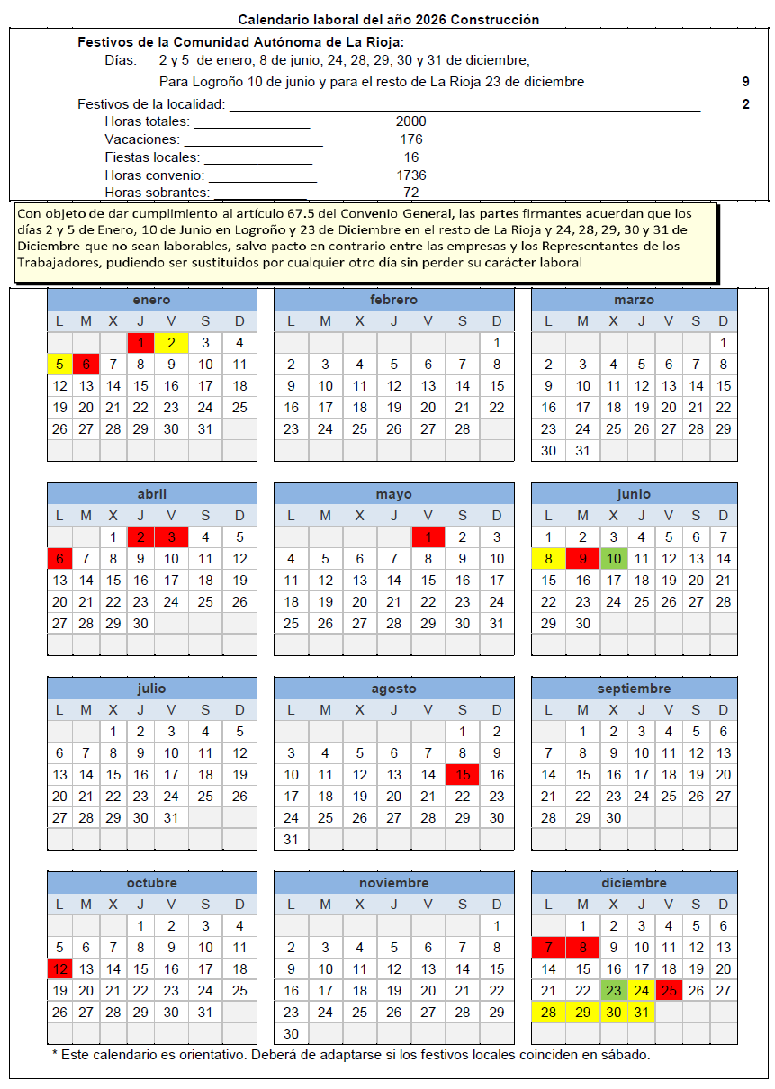 CONVENIO COLECTIVO DE EDIFICACIÓN Y OBRAS PÚBLICAS DE LA COMUNIDAD AUTÓNOMA DE LA RIOJA. CALENDARIO LABORAL AÑO 2026.