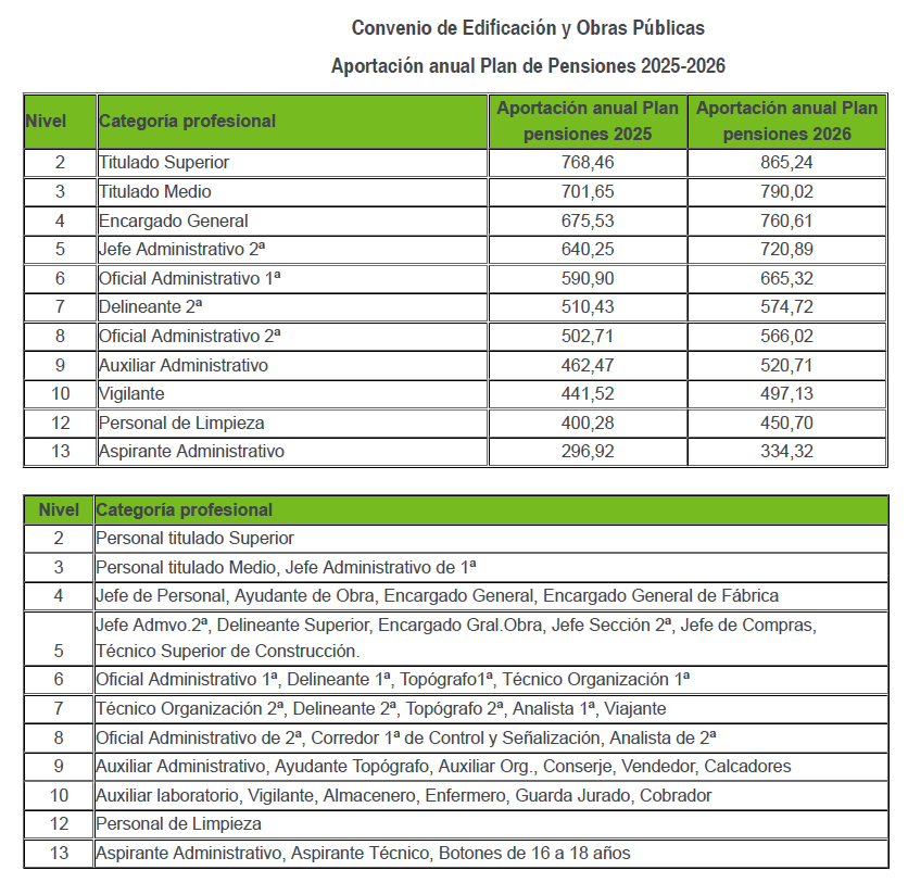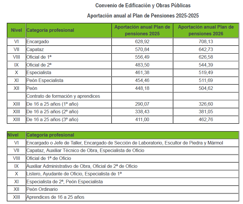 CONVENIO COLECTIVO: se inscribe y publica el acuerdo sobre los importes de las contribuciones empresariales al plan de pensiones (aportaciones anuales) 2025-2026 del convenio colectivo de trabajo para las empresas con actividades de Edificación y Obras Públicas.