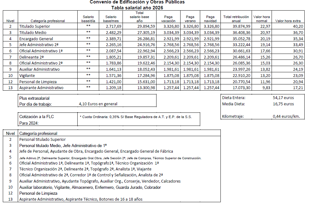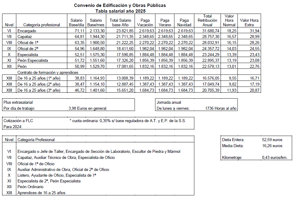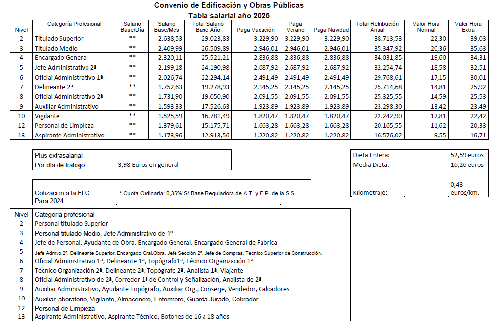 De acuerdo con lo estipulado al efecto en el artículo 20º del Convenio Colectivo de Trabajo de aplicación para las empresas con actividades de Edificación y Obras Públicas de la Comunidad Autónoma de La Rioja para los años 2022-2026, durante el cuarto año de su vigencia, los trabajadores afectados por este Convenio, percibirán por el concepto de salario base desde el 1 de enero al 31 de diciembre de 2025, el que para cada categoría profesional se detalla en las Tablas Salariales incluidas en esta Acta, producto de incrementar los salarios vigentes al 31 de diciembre de 2024, en un 3,50%.