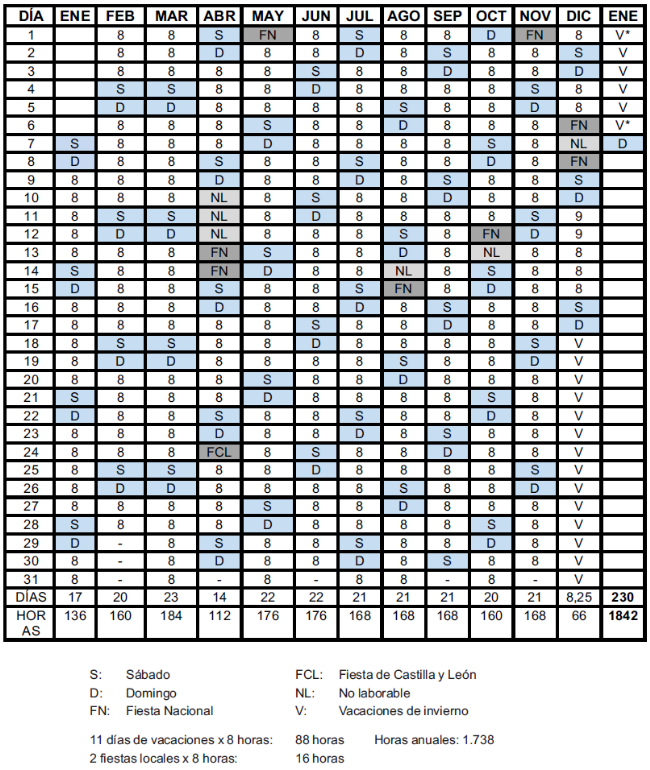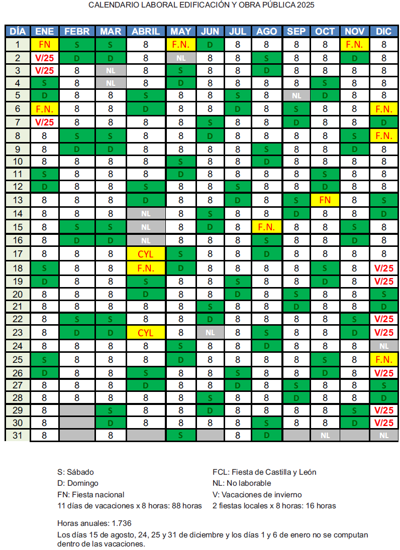 Vista el acta de la reunión, de fecha 11 de diciembre de 2024, de la comisión negociadora del convenio colectivo de trabajo provincial del sector de edificación y obras públicas de León (número convenio 24002005011980), por la que se aprueba el calendario laboral para el año 2025 y de conformidad con lo dispuesto en el artículo 90, apartados 2 y 3, del real Decreto Legislativo 2/2015, de 23 de octubre, por el que se aprueba el Texto refundido de la Ley del Estatuto de los Trabajadores (BOE 24.10.2015), en el artículo 2.1.a) del real Decreto 713/2010, de 28 de mayo, sobre registro y depósito de convenios colectivos, acuerdos colectivos de trabajo y planes de igualdad (BOE 12.06.2010), en el real Decreto 831/1995, de 30 de mayo, sobre traspaso de funciones y servicios de la administración del Estado a la comunidad de Castilla y León en materia de trabajo (BOE 06.07.1995), en la orden EyH/1139/2017, de 20 de diciembre, por la que se desarrolla la estructura orgánica y se definen las funciones de las oficinas Territoriales de Trabajo de las Delegaciones Territoriales de la Junta de Castilla y León (Boletín Oficial de Castilla y León 22.12.2017)) y en el Decreto 8/2022, de 5 de mayo, por el que se establece la estructura orgánica de la consejería de Industria, comercio y Empleo (Boletín Oficial de Castilla y León 06.05.2022).