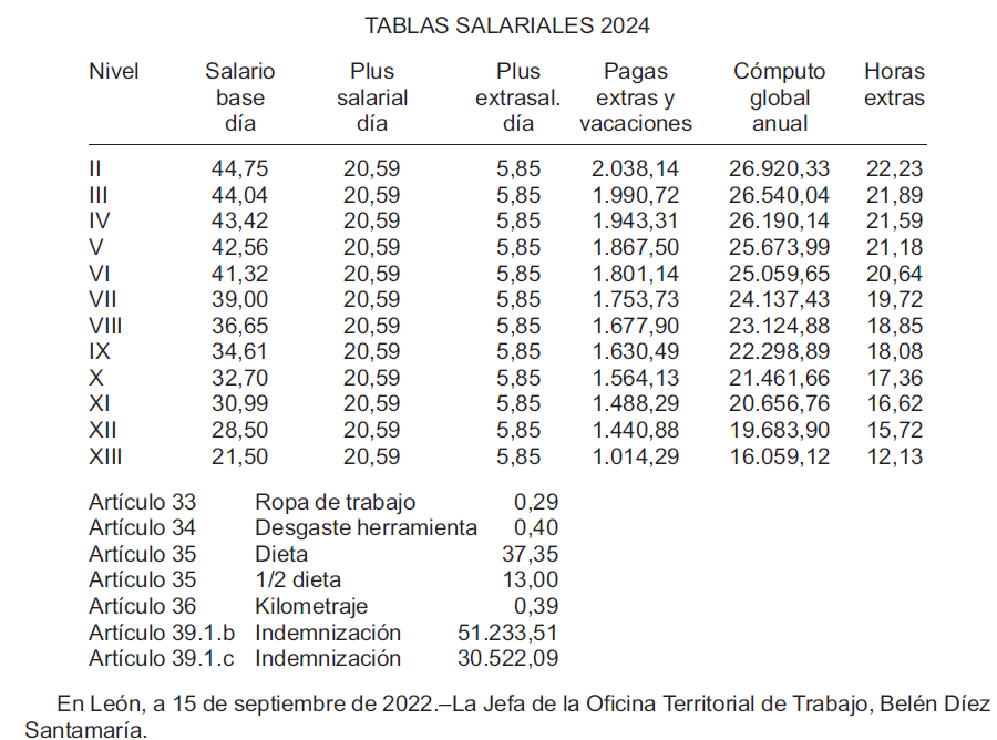 Vista el acta de fecha 13 de septiembre de 2022, de firma de las tablas salariales correspondientes a los años 2022, 2023 y 2024 del convenio colectivo de trabajo, de ámbito provincial, del sector de Edificación y Obras Públicas de León (n.º convenio 24002005011980) y, de conformidad con lo dispuesto en el artículo 90, apartados 2 y 3, del real Decreto Legislativo 2/2015, de 23 de octubre, por el que se aprueba el Texto refundido de la Ley del Estatuto de los Trabajadores (BOE 24.10.15), en el real Decreto 831/1995, de 30 de mayo, sobre traspaso de funciones y servicios de la administración del Estado a la Comunidad de Castilla y León en materia de trabajo (BOE 6.7.95), en la orden PRE/813/22, de 1 de julio, por la que se desarrolla la estructura orgánica y se definen las funciones de las oficinas Territoriales de Trabajo de las Delegaciones Territoriales de la Junta de Castilla y León (Boletín Oficial de Castilla y León 5.7.22) y en el Decreto 8/2022, de 5 de mayo, por el que se establece la estructura orgánica de la consejería de Industria, comercio y Empleo (Boletín Oficial de Castilla y León 6.5.2022).