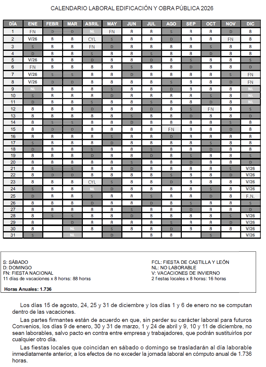 Vista el acta de la reunión, de fecha 1 de diciembre de 2025, de la Comisión negociadora del Convenio Colectivo de trabajo provincial del sector de edificación y obras públicas de León (nº Convenio 24002005011980), por la que se aprueba el calendario laboral para el año 2026 y, de conformidad con lo dispuesto en el artículo 90, apartados 2 y 3, del Real Decreto Legislativo 2/2015, de 23 de octubre, por el que se aprueba el Texto Refundido de la Ley del Estatuto de los Trabajadores (BOE 24.10.15), en el Real Decreto 831/1995, de 30 de mayo, sobre traspaso de funciones y servicios de la Administración del Estado a la Comunidad de Castilla y León en materia de trabajo (BOE 06.07.95), en la Orden PRE/813/22, de 1 de julio, por la que se desarrolla la estructura orgánica y se definen las funciones de las Oficinas Territoriales de Trabajo de las Delegaciones Territoriales de la Junta de Castilla y León (BOCYL 05.07.22) y en el Decreto 8/2022, de 5 de mayo, por el que se establece la estructura orgánica de la Consejería de Industria, Comercio y Empleo (BOCYL 06.05.2022).