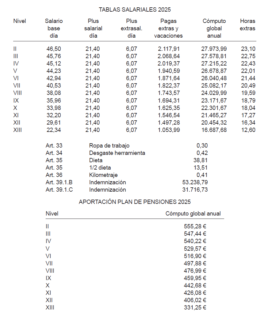 Primero. – Aprobar las tablas salariales y la aportación al plan de pensiones para el año 2025, con efectos de 01-01-2025, tras la aplicación del 0,4% en virtud de la cláusula de garantía salarial establecida en el artículo 55.4 del VII Convenio General del Sector de la Construcción (VII CGSC), se pacta un incremento en la tabla salarial para el año 2025 del 3,5% y la contribución al plan de pensiones en el 0,5%.