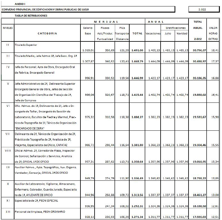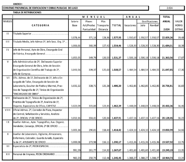 En la ciudad de Lugo a 14.12.2023 se reúnen los representantes de las Centrales Sindicales y de APEC que al margen se relacionan, con el objeto de proceder a la firma, en su caso, a la aprobación de la tabla salarial vigente para el 2024, del Convenio de Edificación y Obras Públicas de la provincia de Lugo suscrito en fecha 28.9.2023, para los años 2023-2026, pendiente de publicación; reconociéndose con legitimación y capacidad suficiente, para los años 2022 al 2026 incluido, con la representatividad que poseen, adoptando los siguientes EXPONEN.