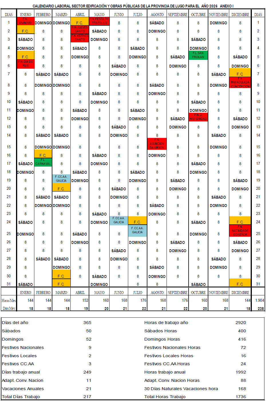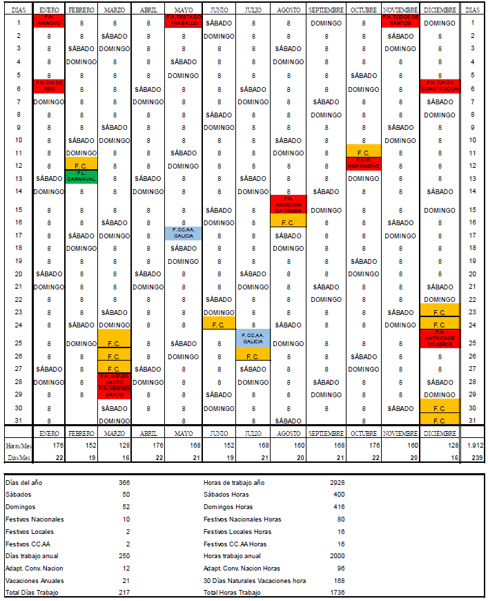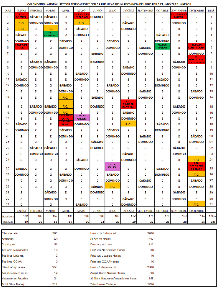 1.- Este sería el calendario que afectaría a toda la provincia (salvando lo dispuesto en el apartado 3). Las fiestas locales, 12 de febrero y 5 de octubre, se refieren al Concello de Lugo. Para el resto de los Concellos serán los que se determinan en el calendario de Fiestas Locales. En aquellos Concellos que el festivo local coincida en sábado/domingo, tendrán un día más de FC (horas cero) para que se adapte la jornada a las 1736 horas, que se señalará por la empresa con acuerdo de las personas trabajadoras.