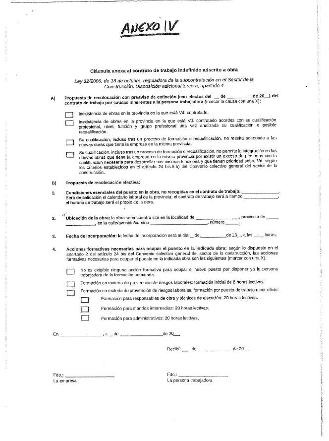 ANEXO IV.- CLÁUSULA ANEXA AL CONTRATO INDEFINIDO ADSCRITO A OBRA.