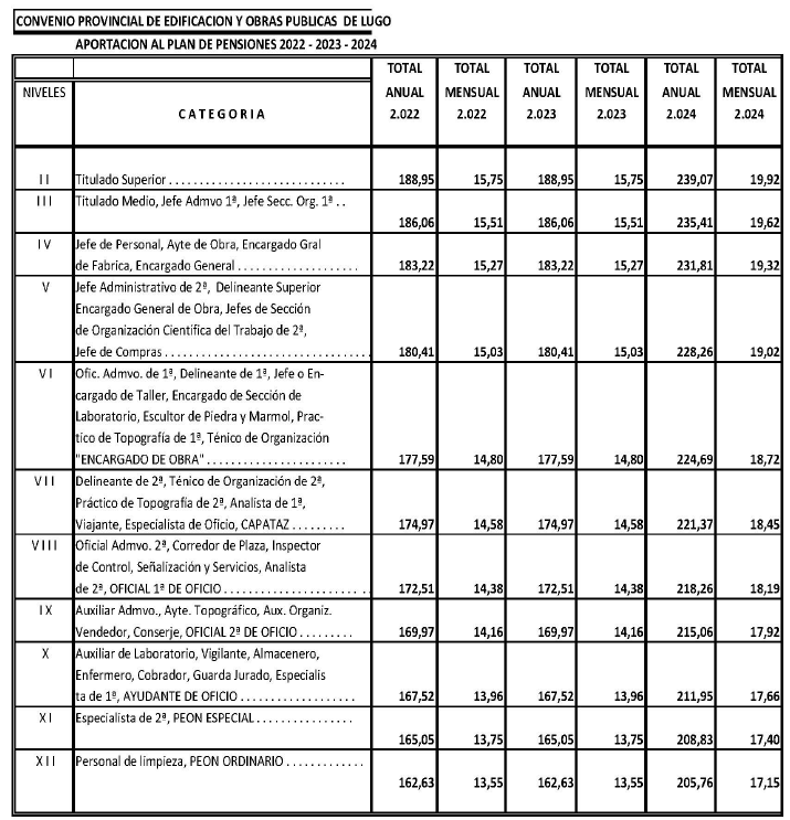 Visto o acordo polo que se aproba a táboa de aportación ao plan de pensións para o «Convenio Colectivo de Edificación y Obras Públicas de la provincia de Lugo», para os anos 2022, 2023 e 2024, asinado o día 14 de decembro de 2023, pola representación empresarial e das centrais sindicais U.G.T. e CC.OO., como membros da comisión negociadora e de conformidade co disposto no artigo 90 apartados 2 e 3 do Real decreto lexislativo 2/2015, do 23 de outubro, polo que se aproba o texto refundido da Lei do Estatuto dos Traballadores, e no Real decreto 713/2010, do 28 de maio, sobre rexistro e depósito de convenios colectivos e acordos colectivos de traballo