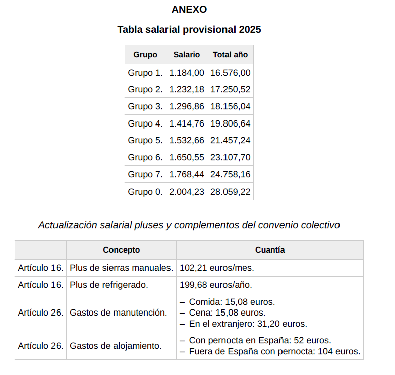 Con efectos desde el 1 de enero de 2025 el salario base del artículo 14.1.2. del convenio colectivo será incrementado en el 4?%. Se firma la Tabla salarial correspondiente como anexo a este Acta.