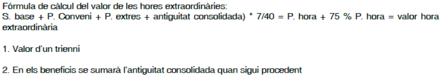 Es podran efectuar treballs en hores extraordinàries sempre que siguin necessàries, i s’abonaran amb el recàrrec del 75% sobre el salari que correspon a cada hora ordinària, conforme a la fórmula que consta a l’annex del respectiu any.