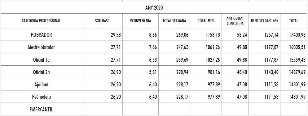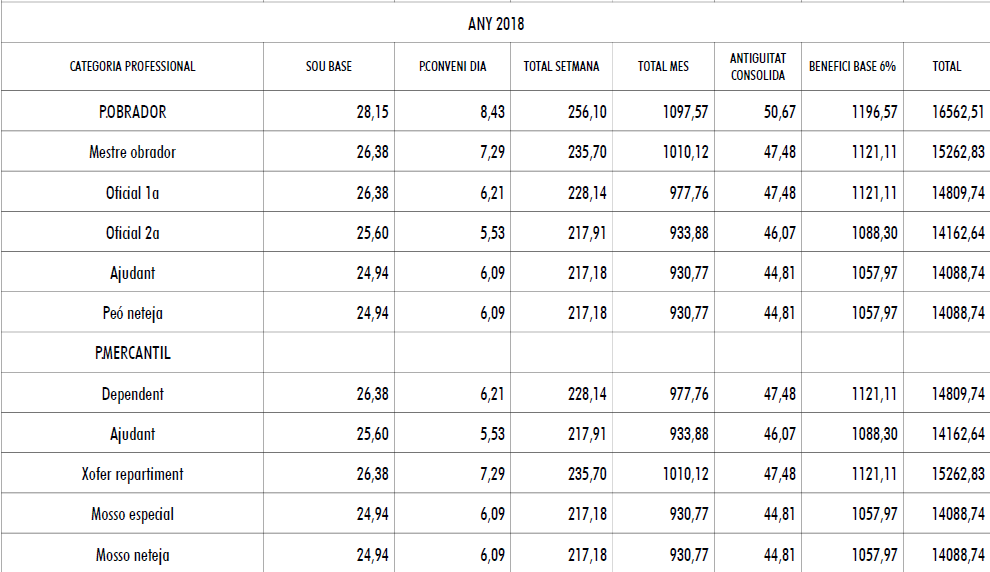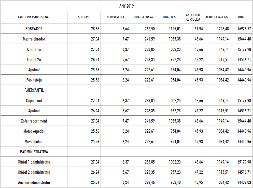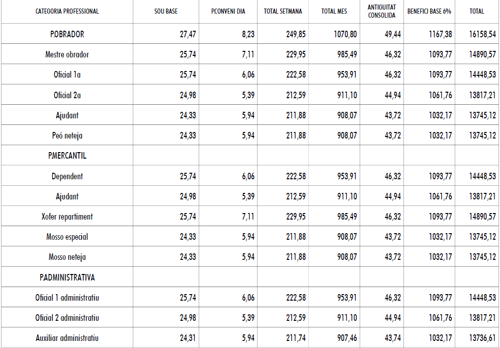 Les empreses abonaran als seus treballadors i treballadores en concepte de participació en beneficis, el que s’estableix la taula salarial annexa del respectiu any, l’import de la qual mai serà inferior al 9% del salari base anual, gratificacions i antiguitat consolidada, si n’hi hagués. Es farà efectiva dins el període comprès entre el dia 1 i el dia 30 de març de l’any següent, i l’empresa pot prorratejar-la en dotzenes parts.