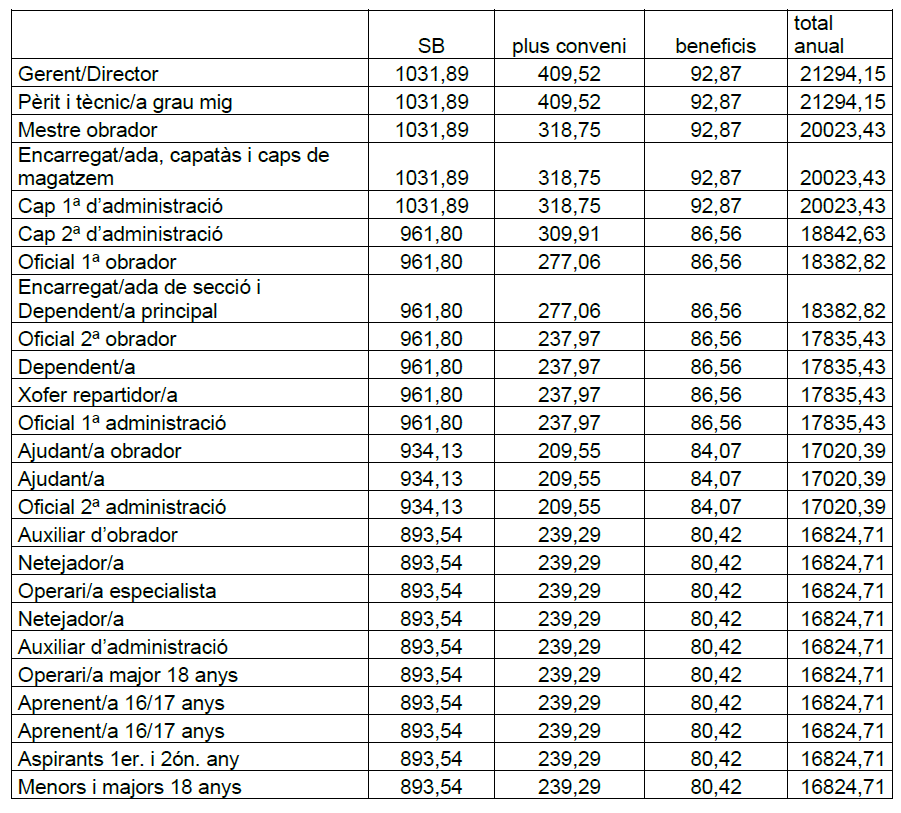 La jornada laboral és de quaranta hores (40) setmanals, de dilluns a diumenge, respectant els descansos legalment establerts. La jornada que es realitzi en diumenge, no podrà ser superior a 6 hores, excepte acord entre les parts i respectant les hores màximes setmanals. Cada hora treballada en diumenge, tindrà un complement de 5 euros per hora, i en cap cas es podrà abonar menys del equivalent a 6 hores (30 euros).