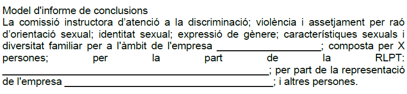 – Formació: Serà imprescindible per formar part de la comissió instructora (titulars o suplents) posseir o rebre formació en prevenció i actuació davant de l’assetjament per raó d’orientació sexual; identitat i/o expressió de gènere; diversitat sexe genèrica o familiar. Aquesta formació haurà de ser presencial i impartida preferentment per associacions LGTBI especialitzades.
