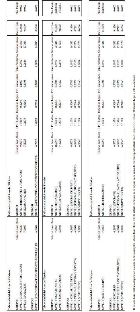 1.º En cumplimiento de lo desarrollado en el anexo de Condiciones Económicas de la citada norma colectiva, y una vez publicado en el BOE el salario mínimo profesional para el año 2023, se procede a la firma de las tablas salariales para el citado ejercicio de 2023, las cuales se adjuntan como anexo a la presente acta y son firmadas por todas las partes.
