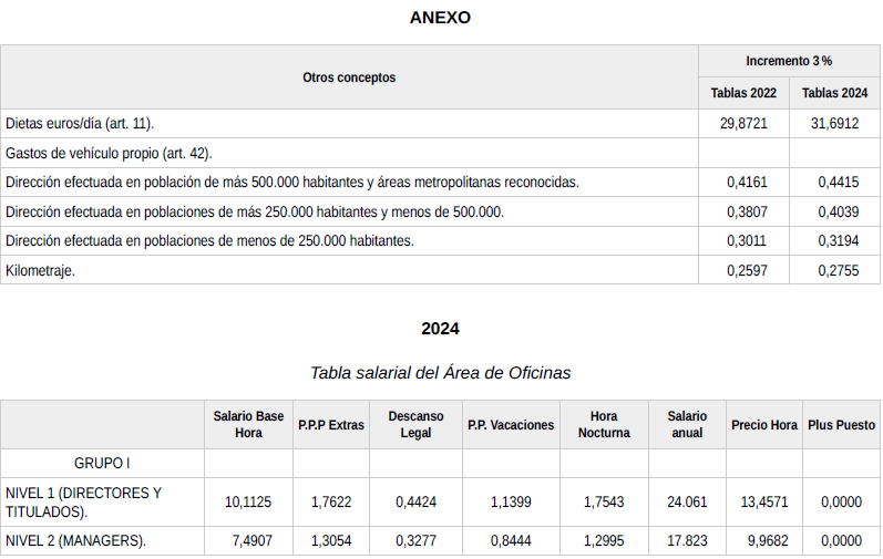 1.º En cumplimiento de lo desarrollado en el anexo de Condiciones Económicas de la citada norma colectiva, y una vez publicado en el «Boletín Oficial del Estado» el salario mínimo profesional para el año 2024, se procede a la firma de las tablas salariales para el citado ejercicio de 2024, las cuales se adjuntan como anexo a la presente acta y son firmadas por todas las partes.