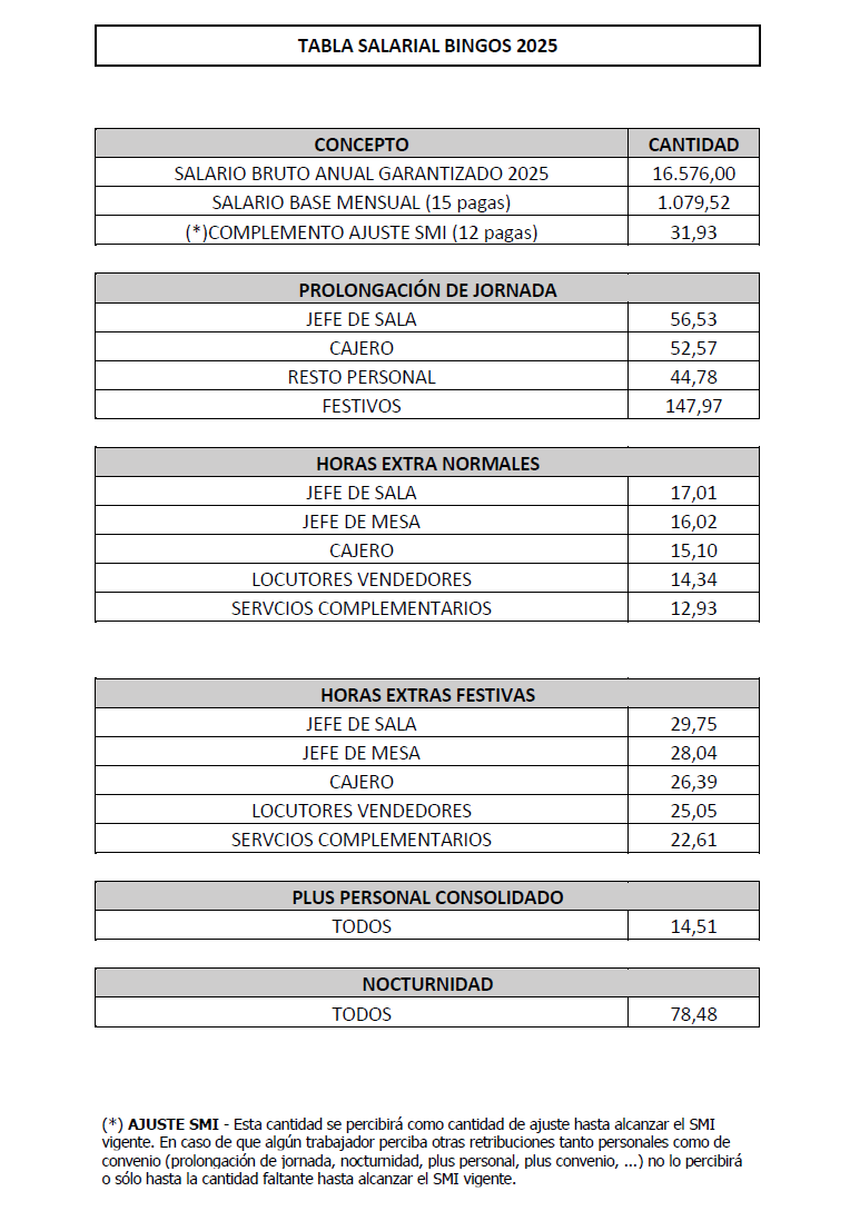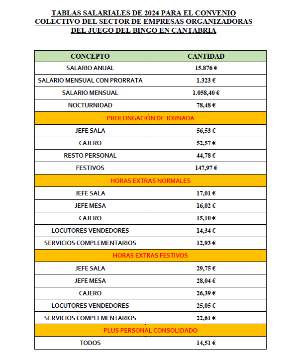 Primero. – Proceder a subsanar las tablas salariales del Convenio Colectivo de Empresas Organizadoras del Juego del Bingo de Cantabria, firmadas en acta de la Comisión Negociadora del Convenio en fecha 29 de enero de 2024, de acuerdo al requerimiento de la Dirección General de Trabajo, de fecha 8 de febrero de 2024, relativo a la adaptación de las tablas salariales al SMI del año 2024 donde se obliga a adecuar las tablas salariales, al menos, a los importes recogidos en el RD 145/2024, de 6 de febrero.
