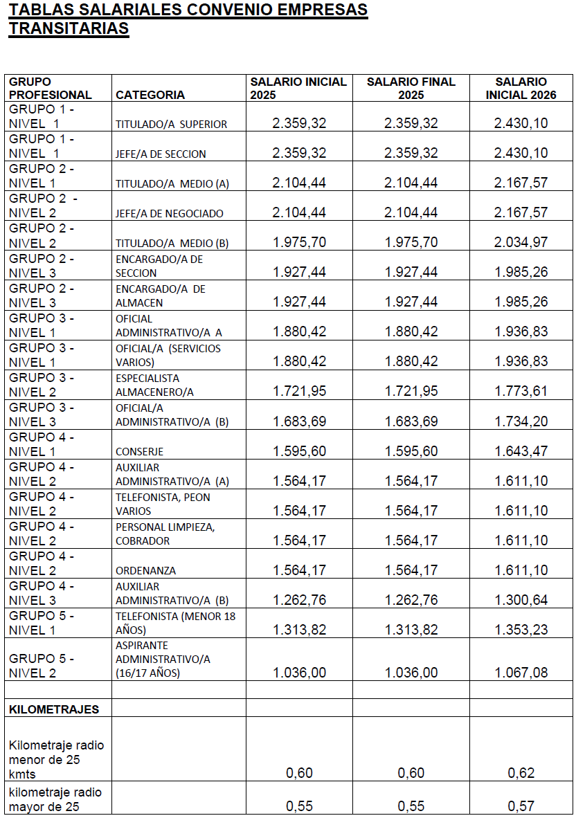Vista la solicitud de inscripción del Acta de acuerdo final suscrita el día 20 de enero de 2026 por la Comisión Paritaria del Convenio Colectivo de ámbito provincial de Valencia para las Empresas Transitarias, por la que se acuerda la actualización de las tablas salariales correspondientes al año 2026.