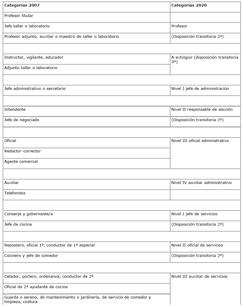 Para mostrar la clasificación del personal, se establece la siguiente lista de equivalencias entre las categorías profesionales que serán de aplicación a partir de la firma del presente Convenio colectivo y las existentes hasta este momento que se mantendrán en lo estipulado en su contrato de trabajo: