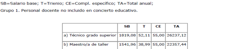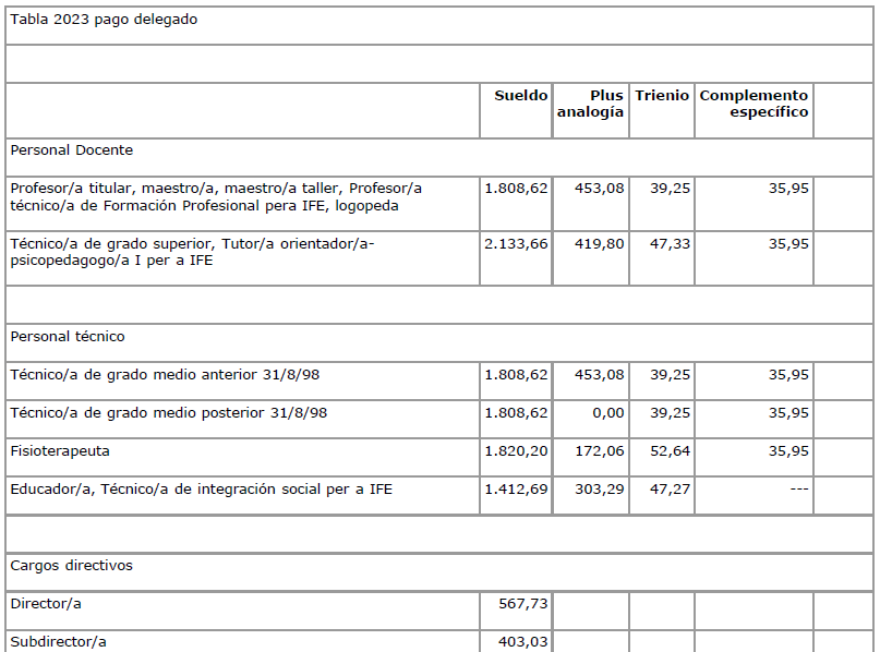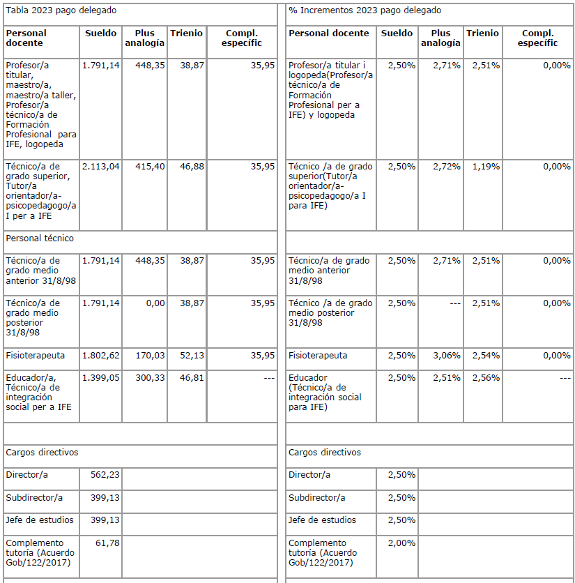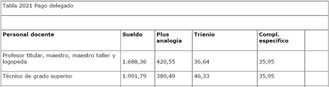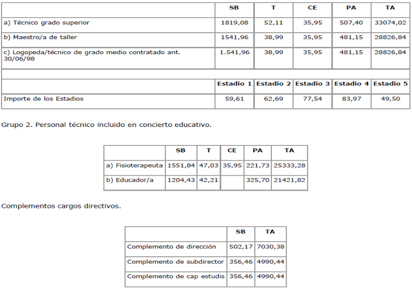 Las retribucions del personal docente y técnico en pago directo quedarà establecido en las tablas salariales correspondientes y a su articulado.