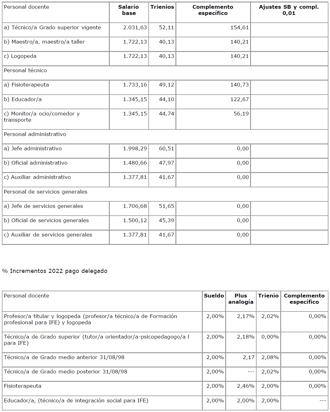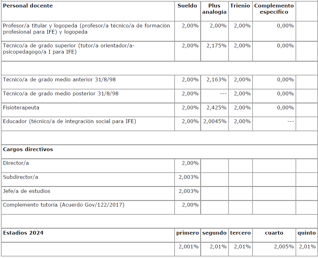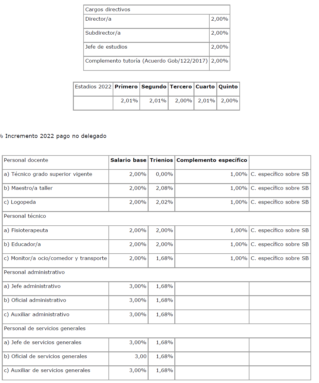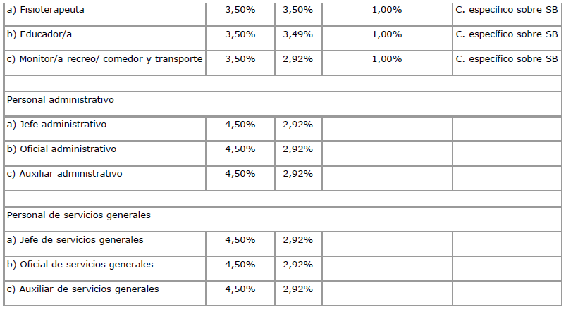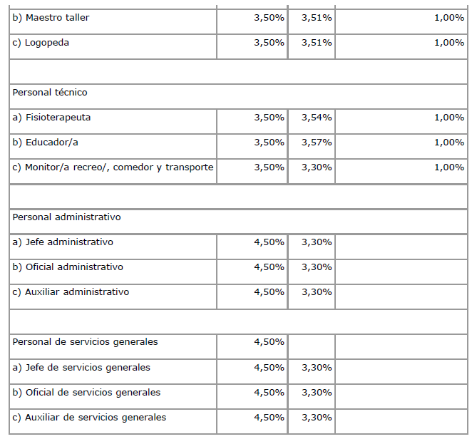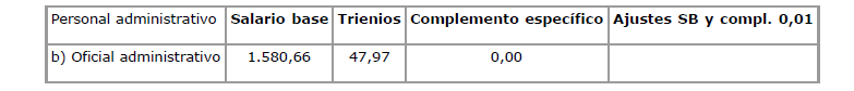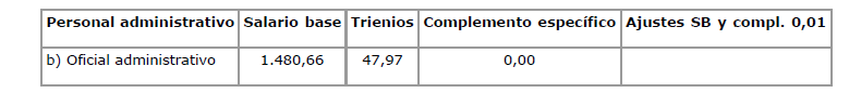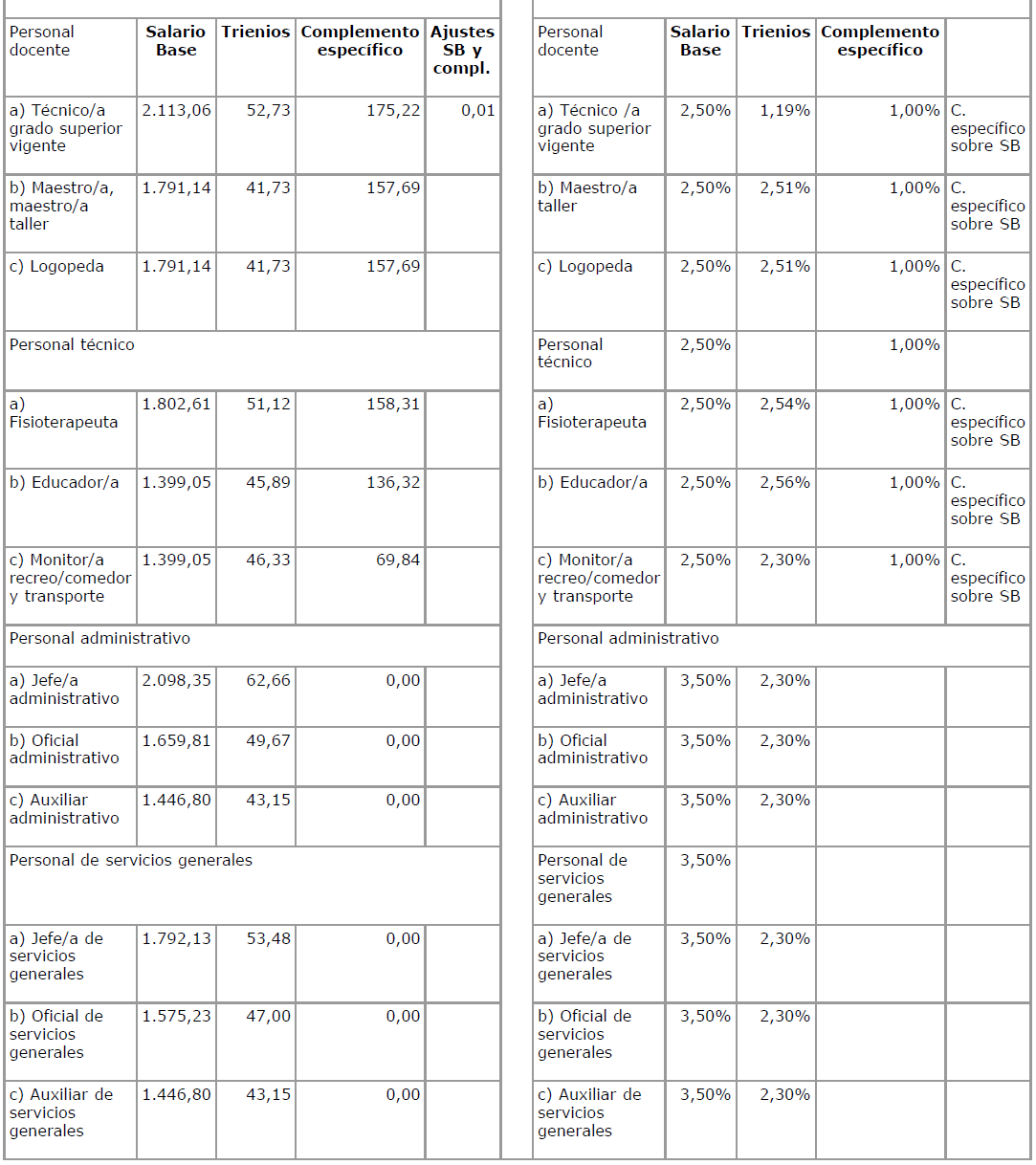 – Aumentar un 2% al salario base, más un 1% adicional del salario base en el complemento específico para aquellas categorías que lo tienen, y las que no, al mismo salario base.
