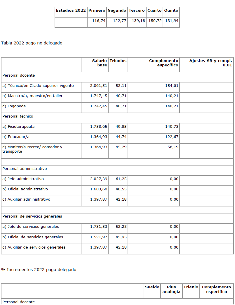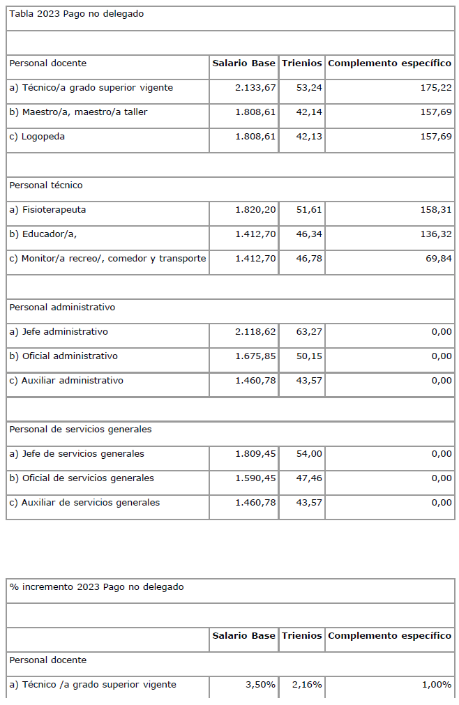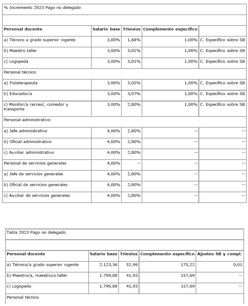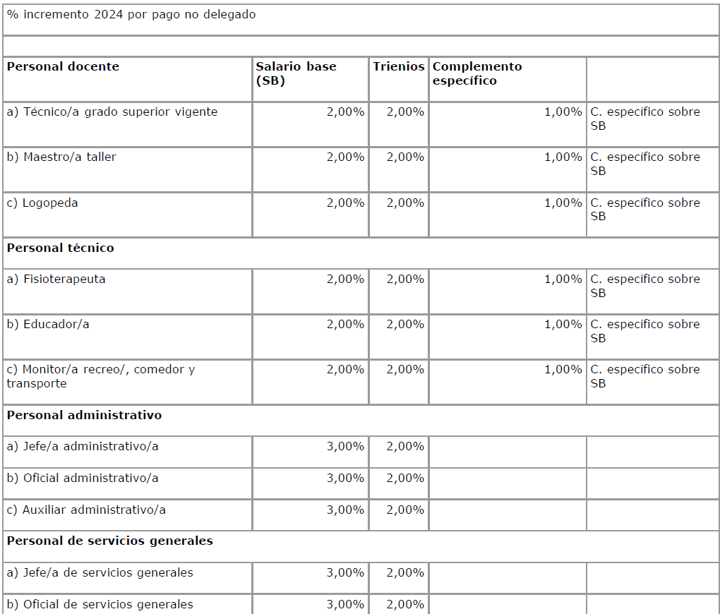 En virtud del acuerdo de fecha 19 de diciembre de 2024, las partes negociadoras acordaron con respecto al pago no delegado, aumentar un 2% al salario base, más un 1% adicional del salario base en el complemento específico para aquellas categorías que lo tienen, y las que no, al mismo salario base.