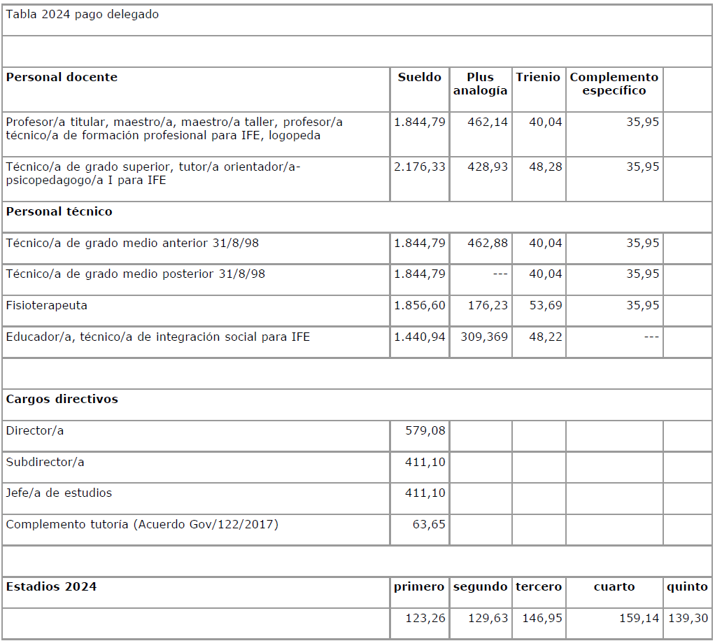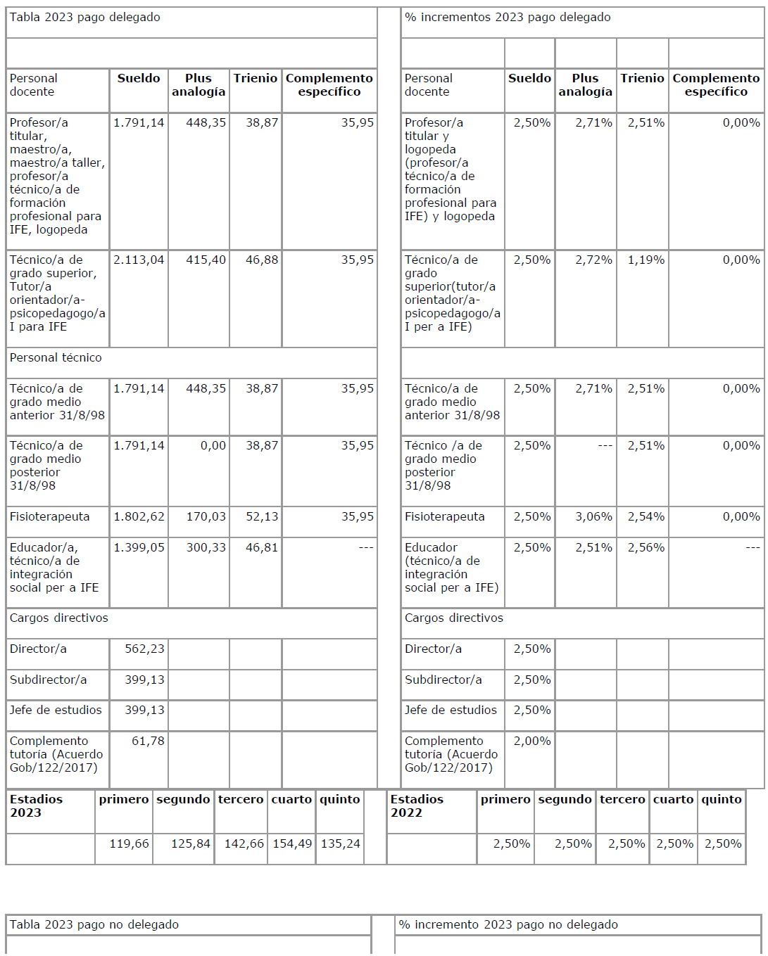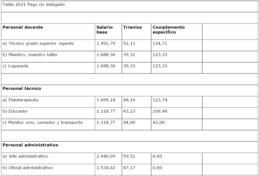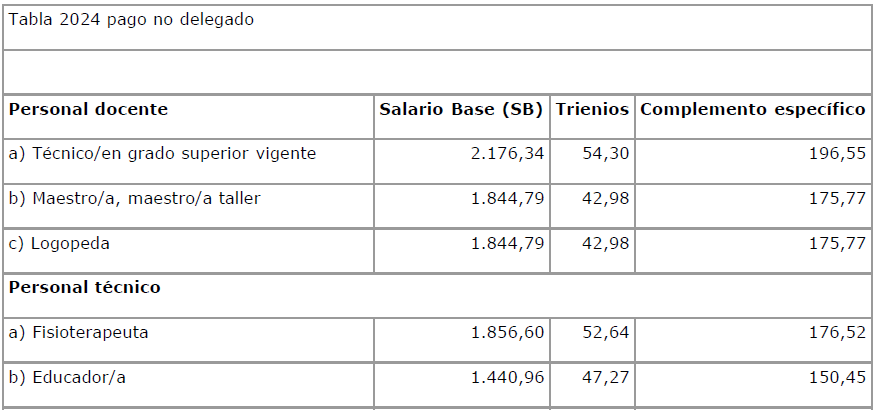 En virtud del acuerdo de fecha 19 de diciembre de 2024, las partes negociadoras acordaron con respecto al pago no delegado, aumentar un 2% al salario base, más un 1% adicional del salario base en el complemento específico para aquellas categorías que lo tienen, y las que no, al mismo salario base.
