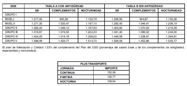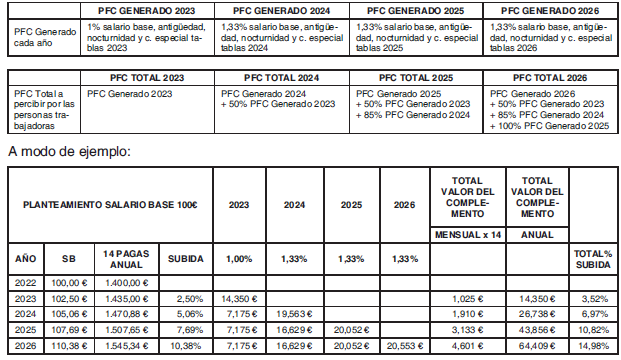 Año 2026: 1,33% del salario base, complemento especial, antigüedad y nocturnidad calculado sobre las tablas salariales del año 2026 + 50% del 1% calculado para el PFC del año 2023 + 85% del 1,33% calculado para el PFC del año 2024 + 100% del 1,33% calculado para el PFC del año 2025.