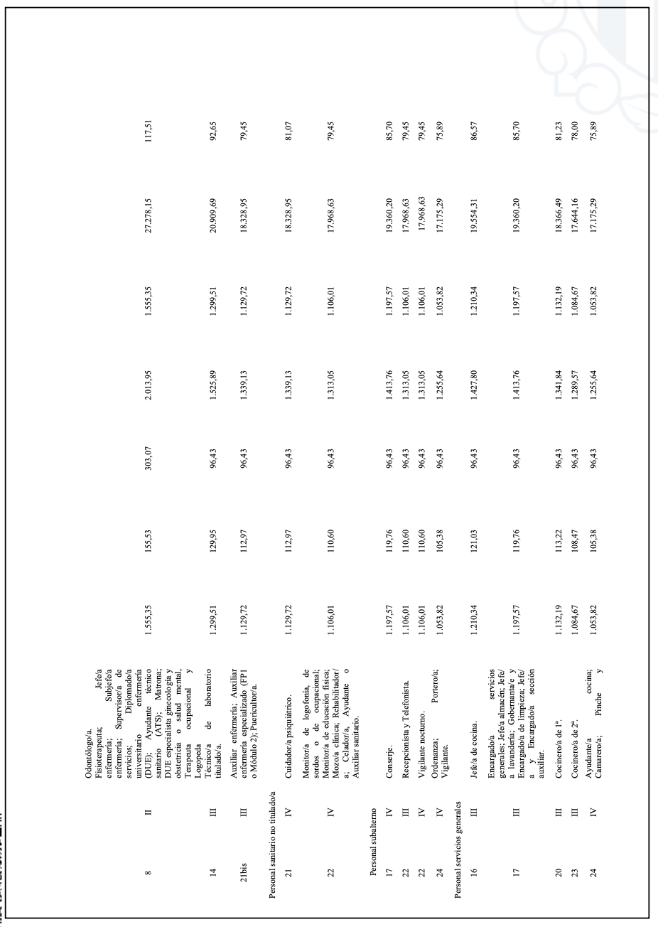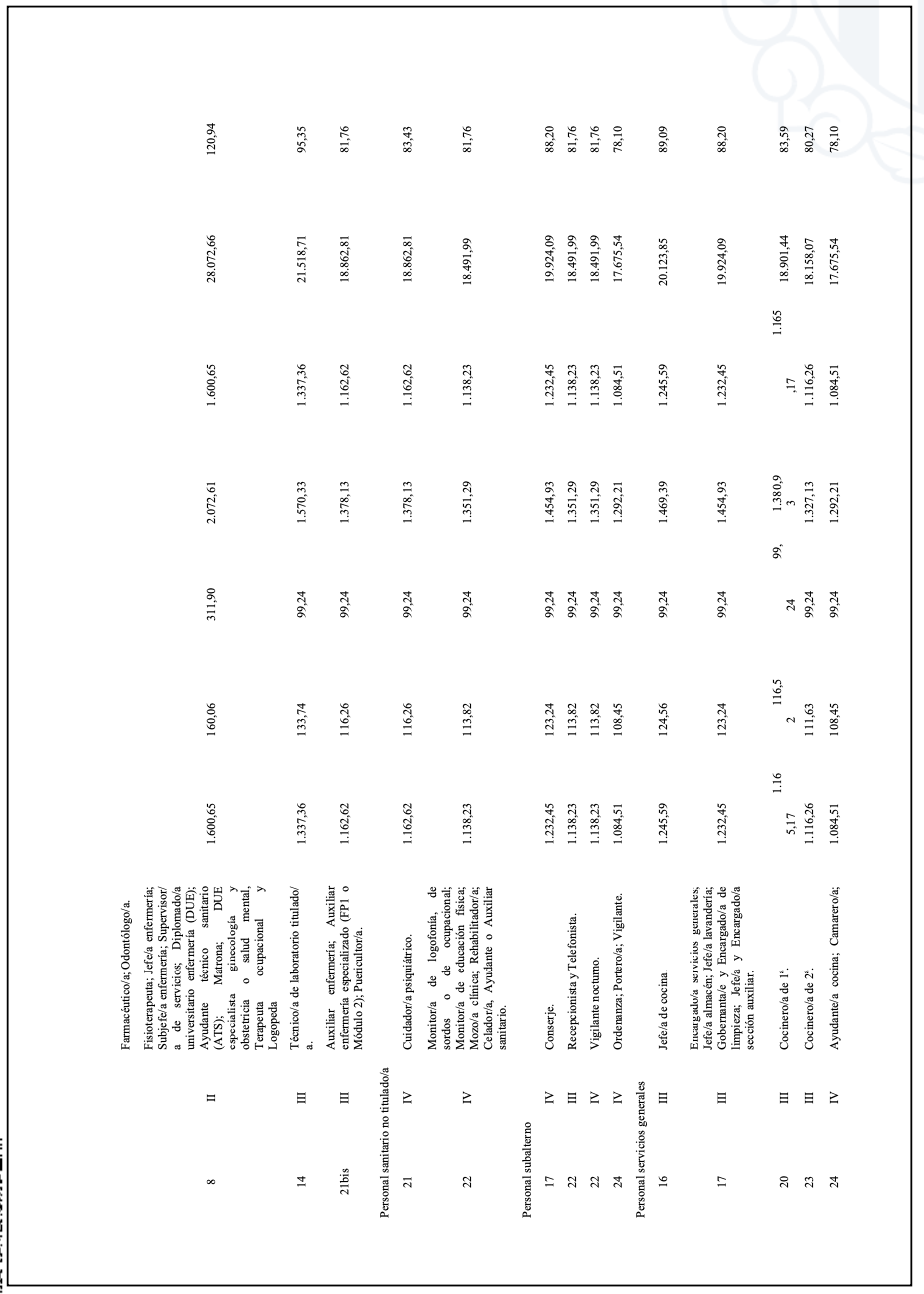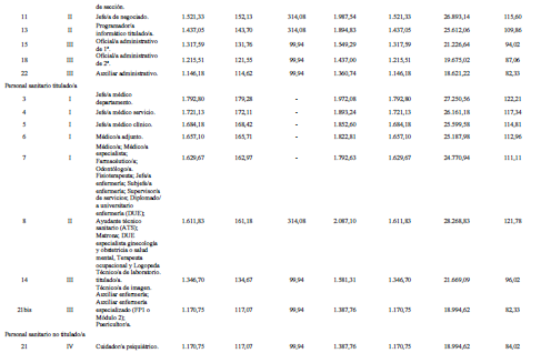 Se incluyen dentro de este grupo los siguientes puestos de trabajo y categorías profesionales: técnico y técnica de grado superior (quienes ostentan los títulos de técnico y técnica en anatomía patológica y citología, en dietética, en documentación sanitaria, en higiene bucodental, imagen para el diagnóstico, en laboratorio de diagnóstico clínico, en ortoprotésica, en prótesis dentales, en radioterapia, en salud ambiental y en audio prótesis) y técnicos de grado medio (quienes ostentan los títulos de técnico en cuidados auxiliares de enfermería y en farmacia) del área de formación profesional sanitaria; oficial y oficiala administrativa de 1ª; oficial y oficiala administrativa de 2ª; auxiliar administrativo; técnico y técnica de laboratorio titulado o titulada; auxiliar de enfermería; auxiliar enfermería especializado (FP1 o módulo 2); puericultor y puericultora; recepcionista y telefonista; jefe y jefa de cocina; encargado y encargada de servicios generales; jefe y jefa de almacén; jefe y jefa de lavandería; gobernanta y encargado y encargada de limpieza; jefe y jefa y encargado o encargada de sección auxiliar; cocinero y cocinera de 1ª; cocinero y cocinera de 2ª; jefe y jefa de mantenimiento o de taller.