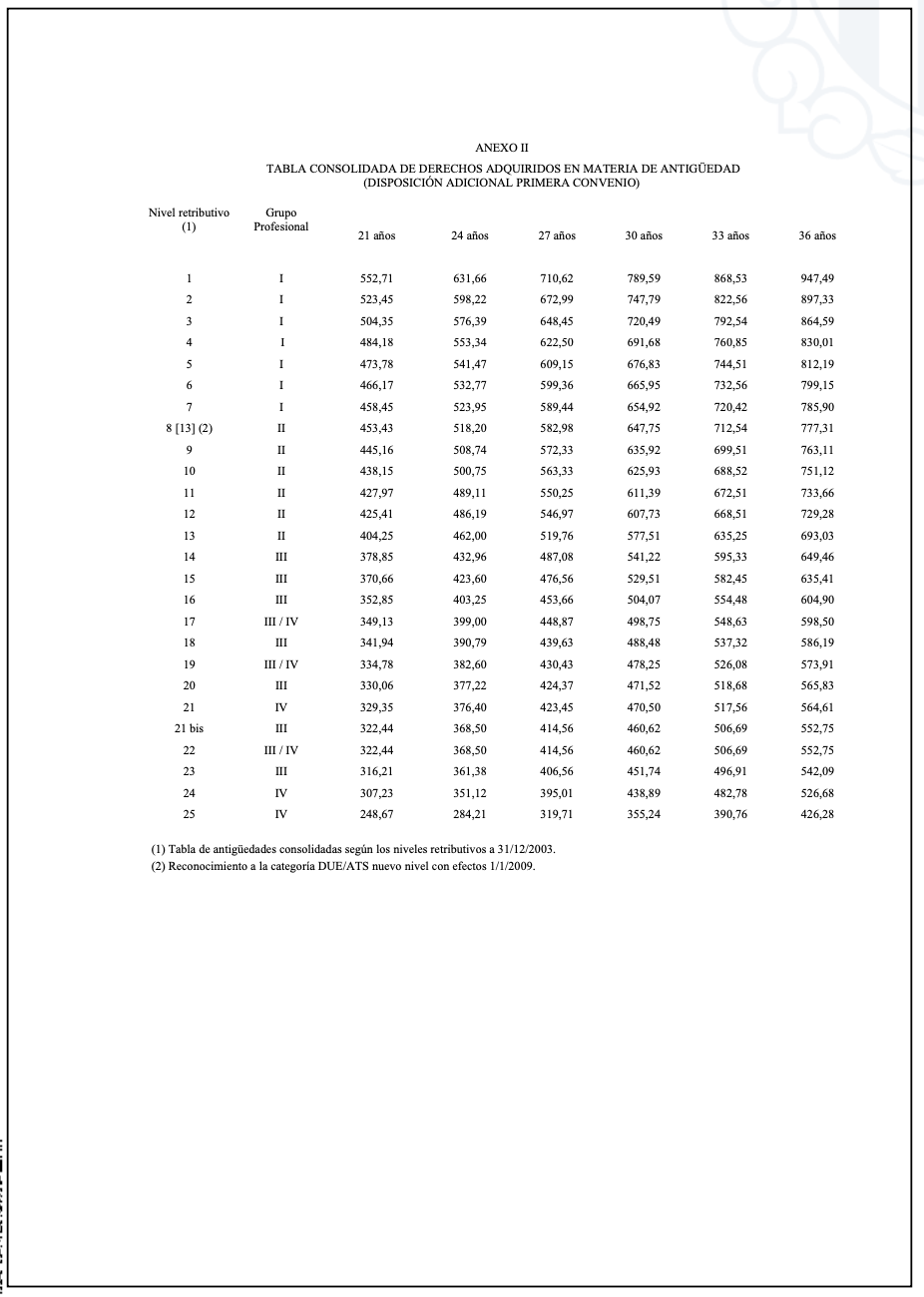 Asimismo, resultado de lo anterior, y en cumplimiento de lo establecido en el último párrafo del artículo 8º.2 del nuevo Convenio Colectivo, se confecciona también la tabla retributiva definitiva para el año 2025, que entrará en vigor el día 1 de enero de 2025, y deja sin efecto la que figura en el anexo I bis del texto articulado del nuevo Convenio Colectivo, sumando al incremento del año 2025 fruto de la revisión salarial prevista en el segundo párrafo del punto 1 del artículo 8º del nuevo Convenio Colectivo, los importes resultantes de los incrementos definitivos del año 2024. Igualmente dicha tabla para el año 2025 es aprobada en este acto por ambas representaciones.
