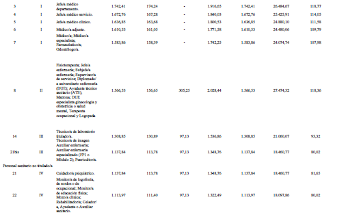 Se incluyen dentro de este grupo los siguientes puestos de trabajo y categorías profesionales: director y directora médico; director y directora administrativa; director y directora de recursos humanos; subdirector y subdirectora médico; subdirector y subdirectora administrativa; titulado y titulada de grado superior; jefe y jefa médico de departamento; jefe y jefa médico de servicio; jefe y jefa médico clínico; médico adjunto; médico; médico especialista; farmacéutico y farmacéutica; y odontólogo y odontóloga.