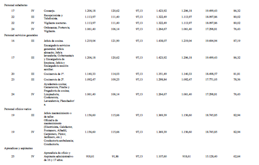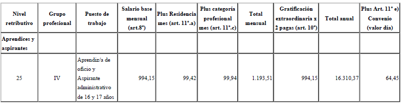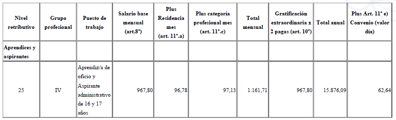 Respecto del salario de los puestos de `Aprendiz/a de oficio´ y `Aspirante Administrativo de 16 y 17 años´ (nivel retributivo 25, grupo profesional IV), efectivamente, a raíz de la aprobación, el pasado día 6 de febrero de 2024, con posterioridad a la firma el día 15 de enero de 2024 del nuevo Convenio Colectivo, del salario mínimo para 2024 (Real Decreto 145/2024), las retribuciones fijas contenidas en la tabla definitiva para 2024 del nuevo Convenio Colectivo aprobada en la anterior reunión de la Comisión Paritaria celebrada el día 17 de enero de 2024 para dichos puestos de trabajo, han quedado por debajo de dicho salario. En su virtud, la Comisión Paritaria aprueba en este acto las nuevas retribuciones fijas (jornada a tiempo completo) para los dos años de vigencia del nuevo Convenio Colectivo (2024 y 2025) para los puestos de trabajo de `Aprendiz/a de oficio´ y `Aspirante Administrativo de 16 y 17 años´ (nivel retributivo 25, grupo profesional IV), dejando sin efecto las contenidas para los indicados puestos de trabajo en las tablas adjuntadas como Anexo I y Anexo I (bis) al acta de la reunión de la Comisión Paritaria celebrada el día 17 de enero de 2024. Así, las nuevas retribuciones definitivas para los puestos de trabajo de `Aprendiz/a de oficio´ y `Aspirante Administrativo de 16 y 17 años´, para el año 2024, son las siguientes: