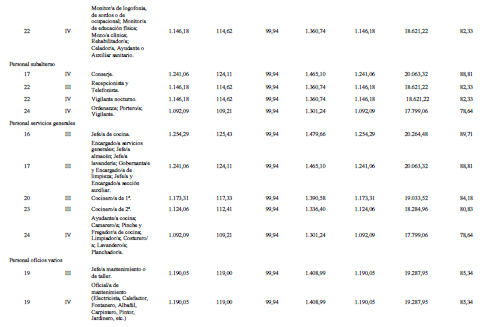 Se incluyen dentro de este grupo los siguientes puestos de trabajo y categorías profesionales: cuidador y cuidadora psiquiátrica; monitor y monitora de logofonía, de sordos o de ocupacional; monitor y monitora de educación física; mozo y moza clínica; rehabilitador y rehabilitadora; celador y celadora, ayudante y ayudante o auxiliar sanitario; conserje; vigilante y vigilanta nocturno; ordenanza; portero o portera; vigilante y vigilanta; ayudante y ayudanta de cocina; camarero y camarera; pinche y fregador y fregadora de cocina; limpiador y limpiadora; costurero y costurera; lavandero y lavandera; planchador y planchadora; oficial y oficiala de mantenimiento (en los oficios de electricista, calefactor, fontanero, albañil, carpintero, pintor, jardinero, etc.); conductor y conductora de ambulancia; conductor y conductora; aprendiz o aprendiza de oficio y aspirante administrativo.