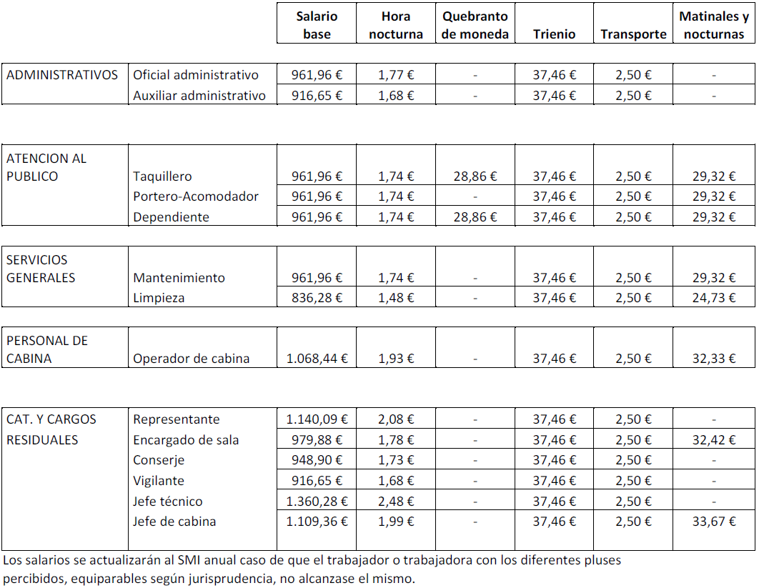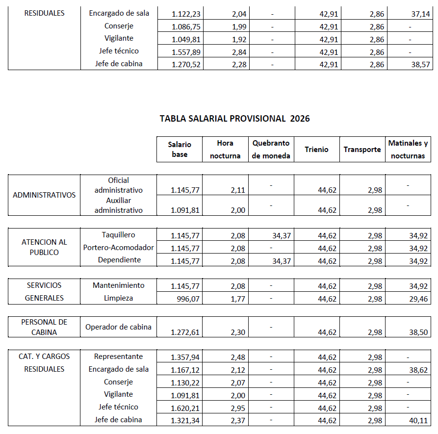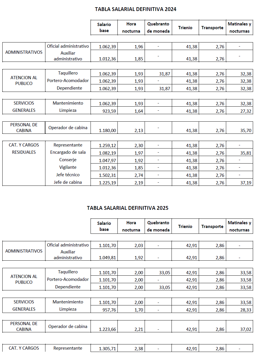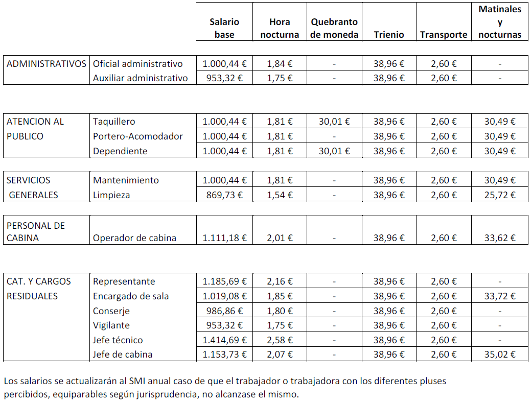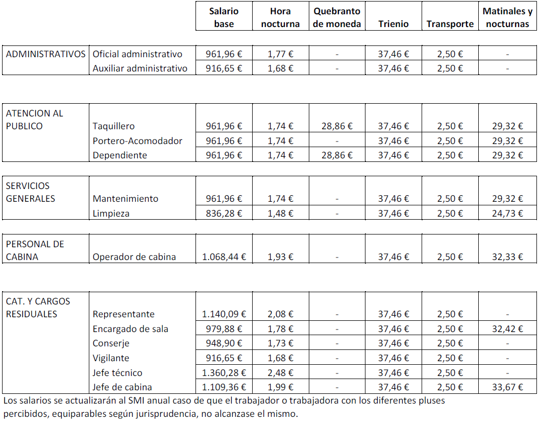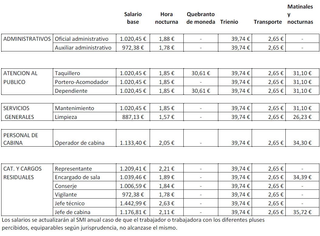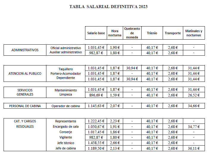 I.- Que en cumplimiento de lo dispuesto en el articulo 20 del Convenio Colectivo de Trabajo para las Empresas de Exhibición Cinematografica de la Provincia de Valencia, los comparecientes proceden a la fijación de las tablas salariales definitivas para el afro 2023.