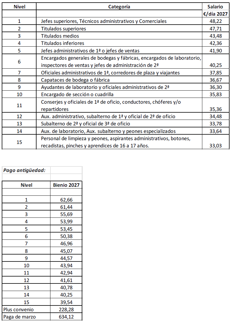 Se establecen tres pagas extraordinarias al año, dos de ellas de 30 días cada una y calculadas sobre los conceptos retributivos de cada persona trabajadora. Su abono se hará en las fechas de 25 de junio y 20 de diciembre. La tercera, por importe de 603,57 € en 2025, 618,65 € en 2026 y 634,12 € en 2027, se abonará el 15 de marzo.