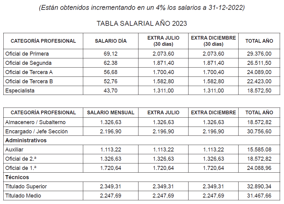 1) 2023: incremento de un 4% sobre todos los conceptos saláriales vigentes a 31-XII-2022 (se incluyen como Anexo I a este convenio las nuevas Tablas Saláriales y de Trienios conteniendo los importes una vez practicado el incremento del 4%).