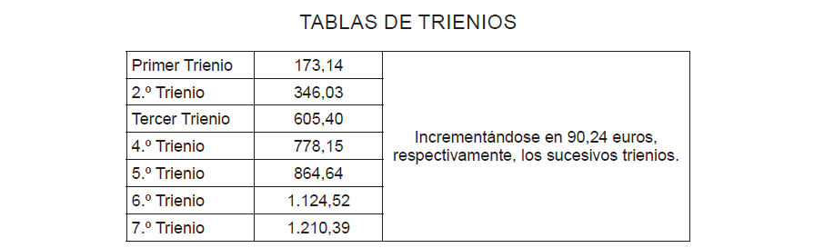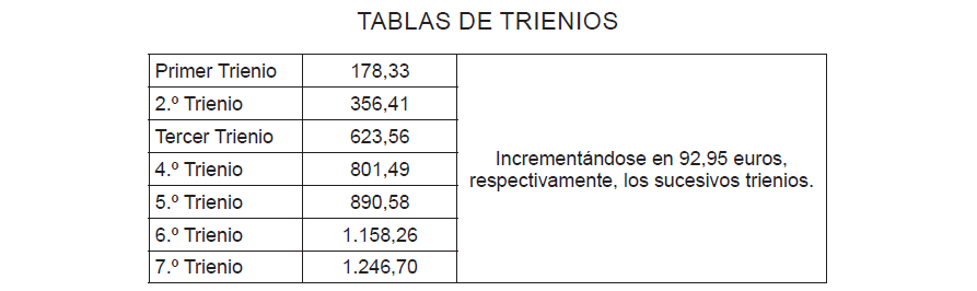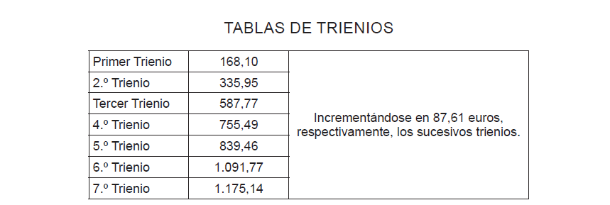 Los importes vienen determinados en la Tabla de Trienios de cuantía anual igual para todas las categorías profesionales que figuran a continuación.