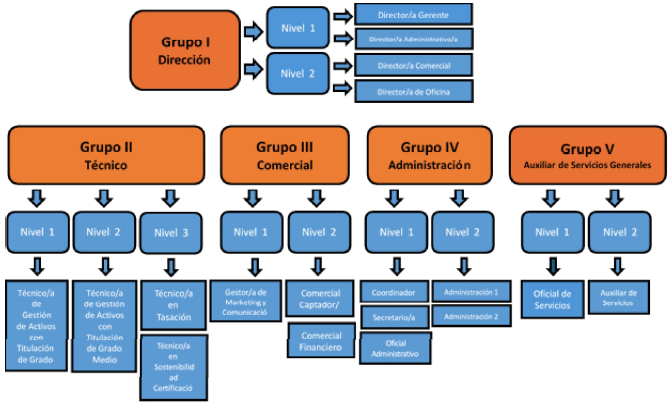Grupo II. Técnico: Pertenecen a este grupo profesional aquellos perfiles que requieren para su desempeño un nivel de complejidad alto en cuanto a los conocimientos técnicos requeridos. Realizan funciones de complejidad alta en las que no se produce transacción. Organiza y controla las diversas operaciones conforme los perfiles profesionales que abarcan diferentes colectivos, entre ellos: consultores/as, asesores/as, gestores/as, abogados/as, arquitectos/as, promotores/as, economistas, técnicos/as o equivalentes.